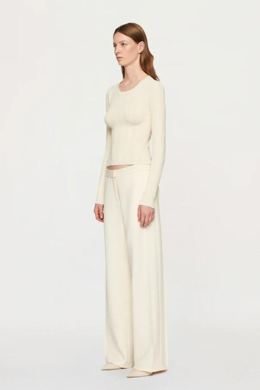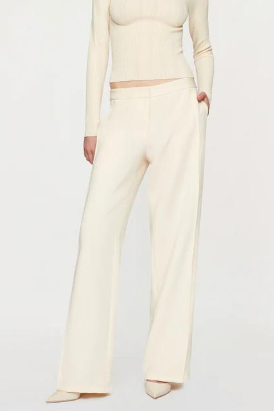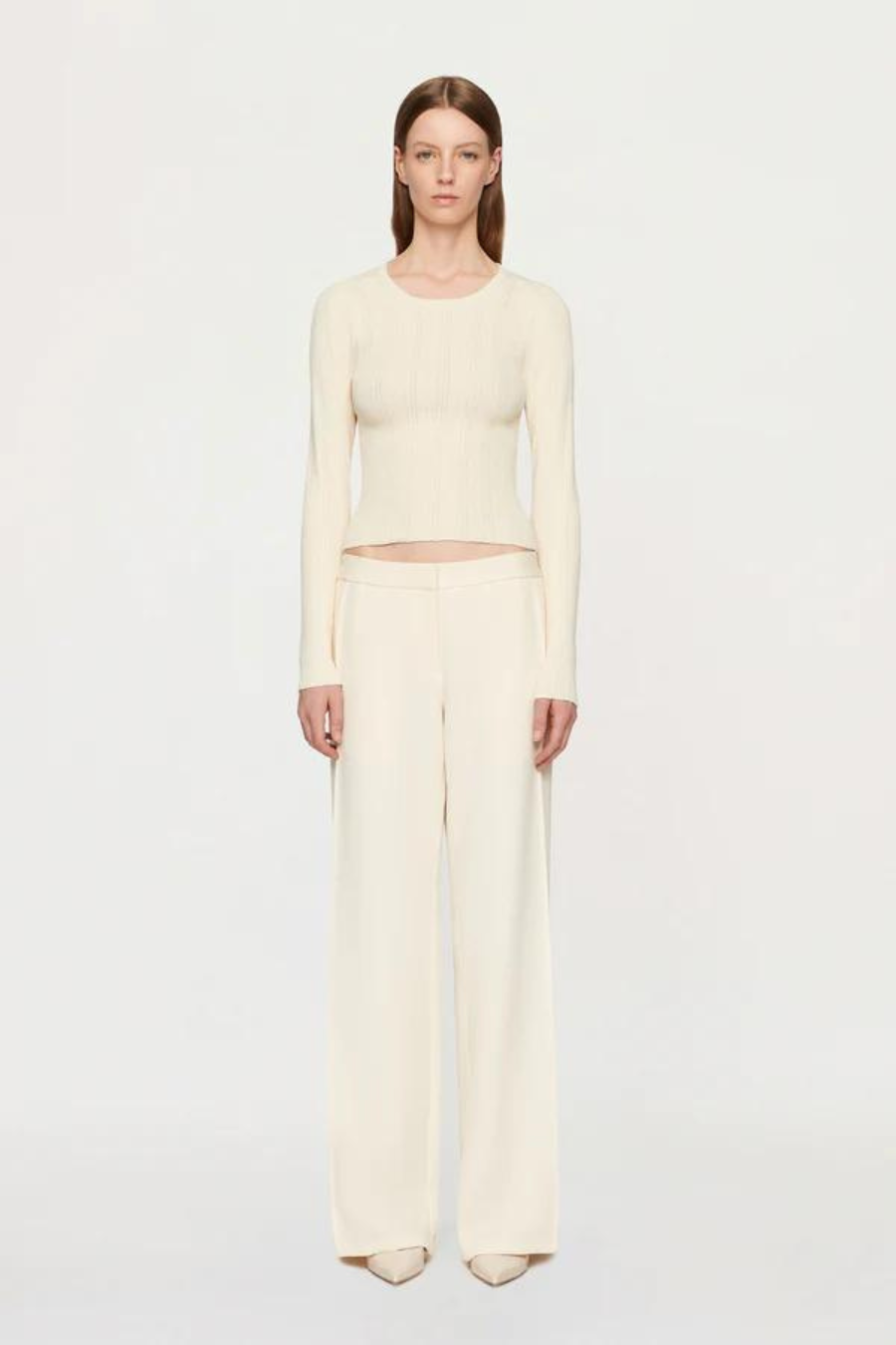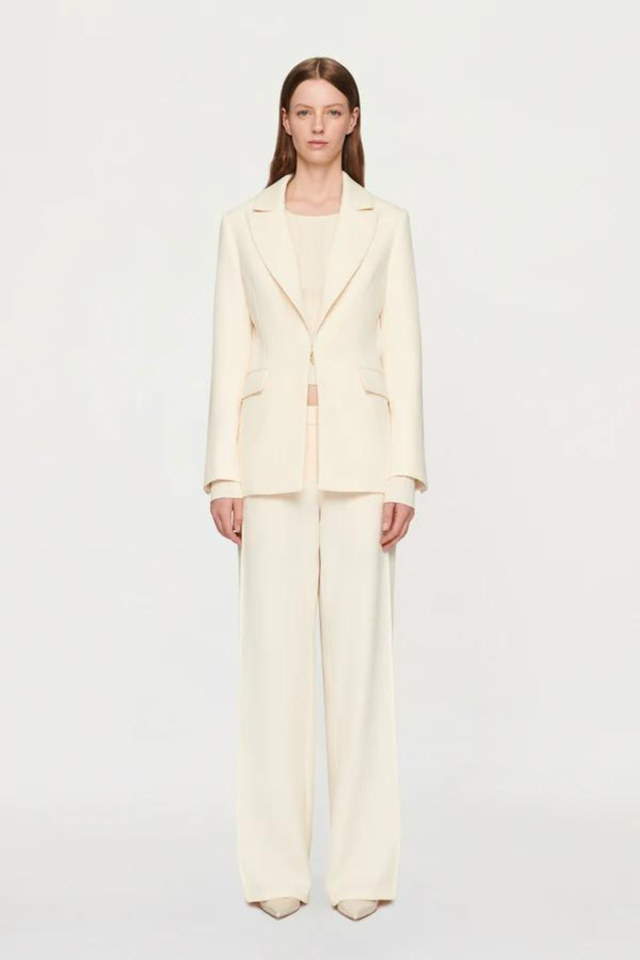 Beautifully crafted in a stunning bonded crepe fabrication in our timeless buff hue. This perfectly tailored trouser features mid rise silhouette with side panel and subtle lapped seam detailing. Inseam pockets and welt pockets at the back. Fly front closure with clean waistband and hook and bar closure.
