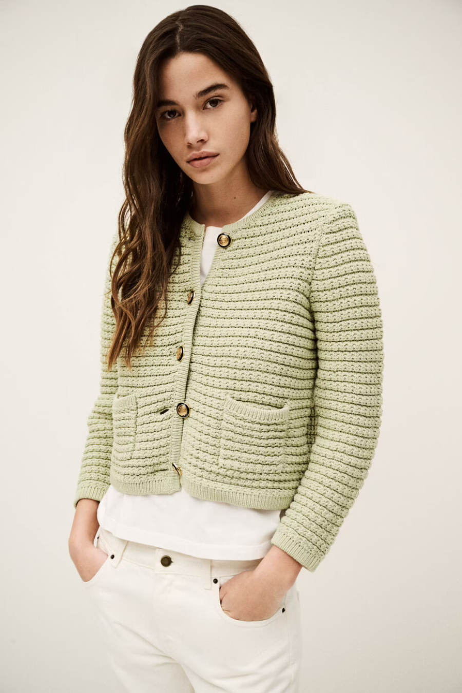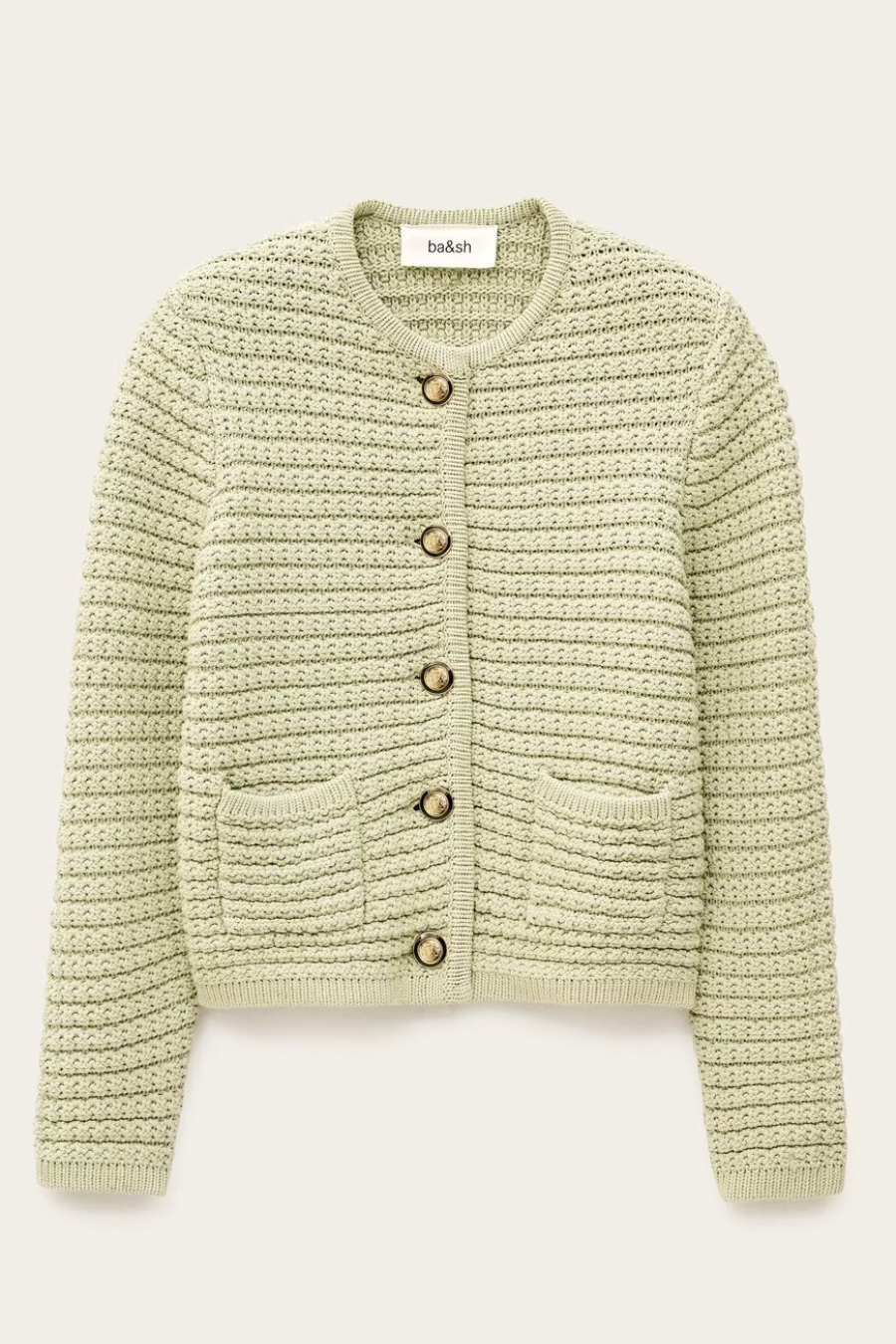 The ba&sh GASPARD cardigan is like a knitted designer jacket. This short cardigan has a round neck with cropped sleeves that show off the wrist. The knit is technical with a decorative Ottoman stitch textured to give a tweed effect. Check out the small shoulder pads that add structure to the cardigan and buttons decorated with a coat of arms. A cardigan like a knitted jacket, it's ideal for spring.