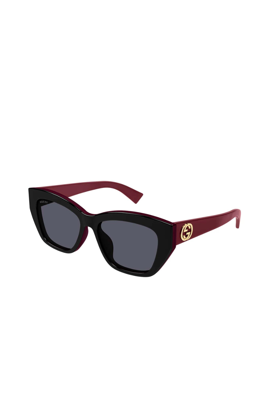 Gucci GG1844SA 004 sunglasses for women, featuring shiny bilayer black / solid burgundy cat eye recycled acetate frame and solid grey bio nylon lenses.