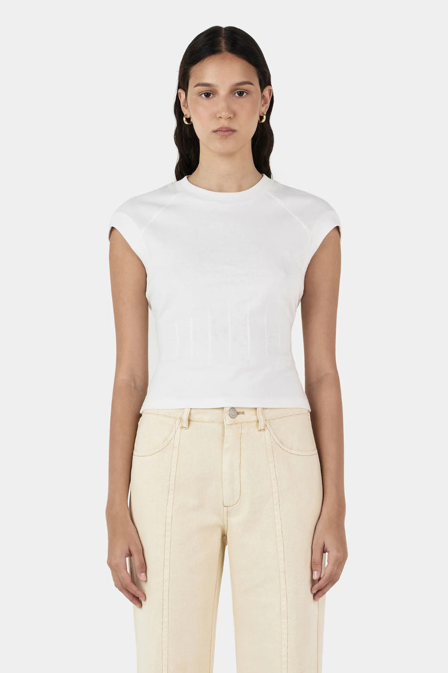 The Gigi Baby Tee is a tight fitting raglan sleeve baby tee. The top features with ribbing and small cap sleeves, as well as a waist tuck stitch detailing. This top is a staple basic piece for any Hansen girls wardrobe.