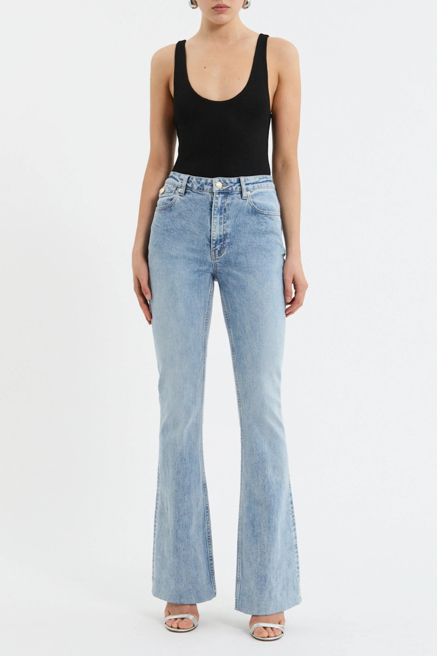 The Gisele Flare Jean in blue light wash denim embodies effortless sophistication with a contemporary edge. Featuring a high-rise waist and flared-leg silhouette, it flatters the figure while elongating the frame. A zip fly front refines the look, complemented by scoop and patch pockets for structure and functionality. Finished with contrast stitching and an RV leather patch, these jeans are a timeless staple for elevated everyday dressing.