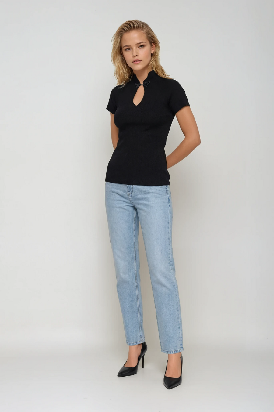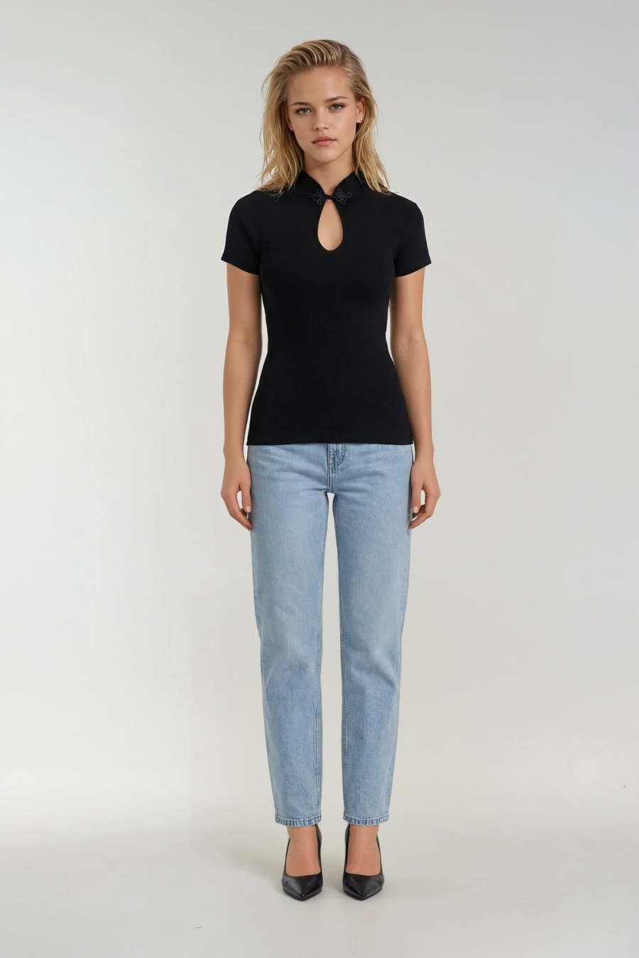 A uniquely elegant second-skin top, featuring a high collar with a teardrop cutout.