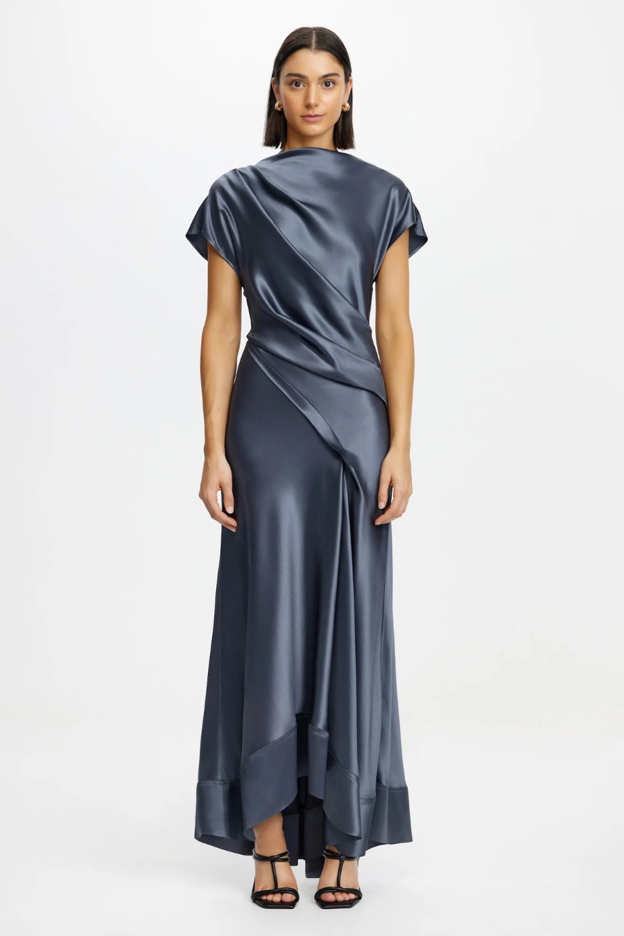 The Glatton Maxi Dress in Slate is a fluid silhouette that evokes effortless elegance. Designed in lustrous woven satin, this drape-style gown features a softly structured bodice and an asymmetric hemline that moves with ease. Finished with a back invisible zip for a clean, refined fit.