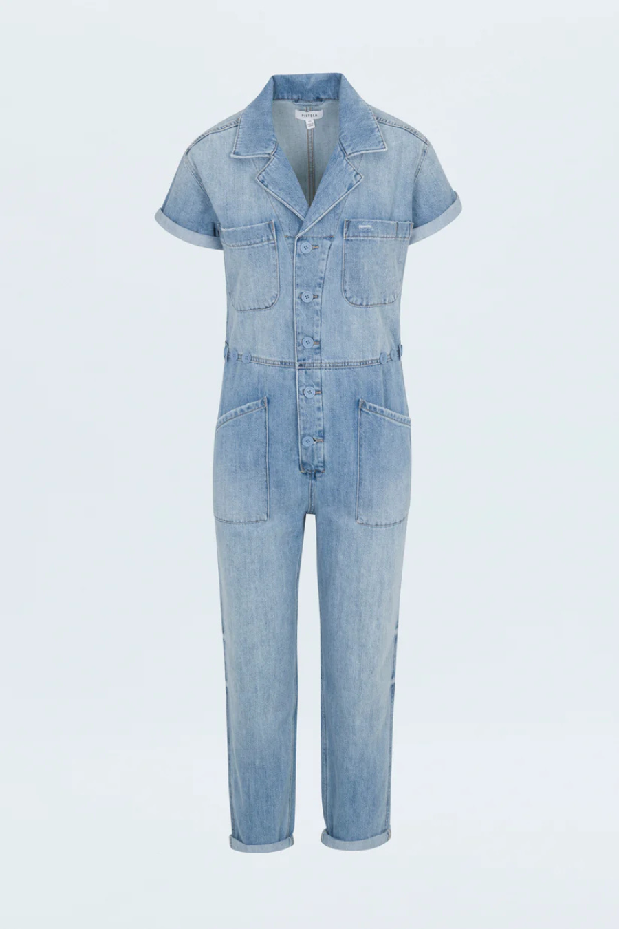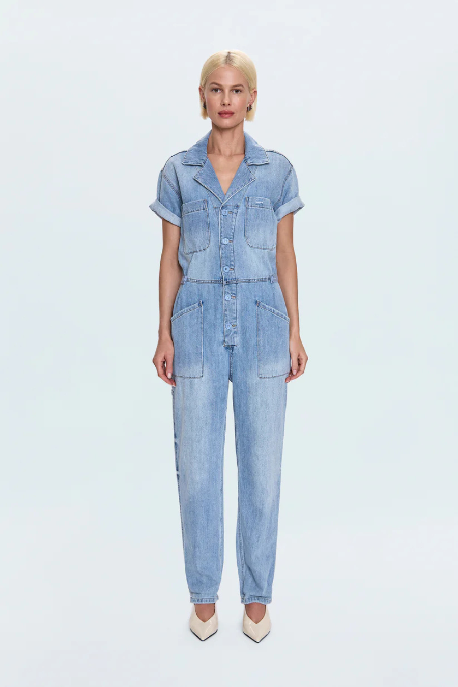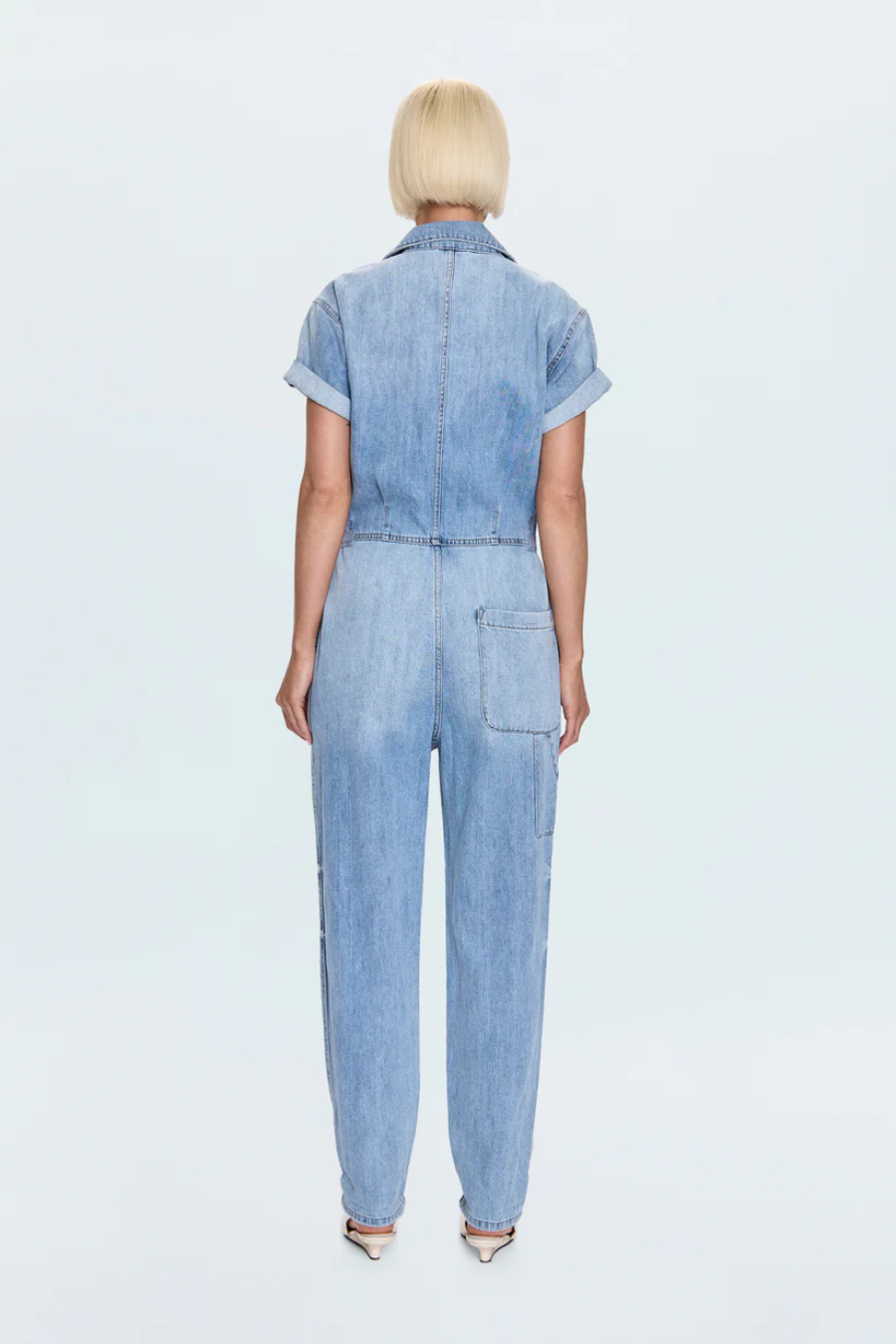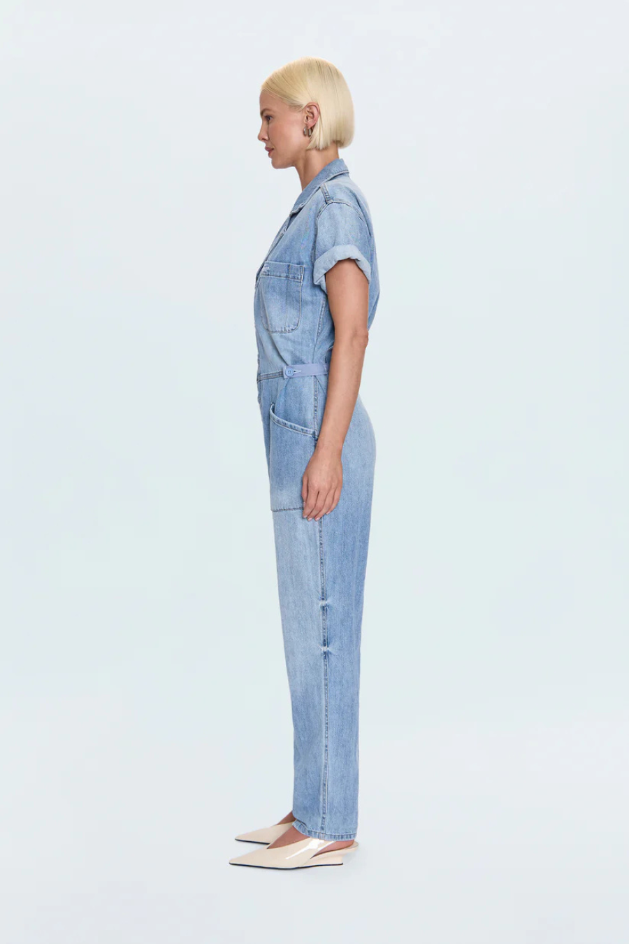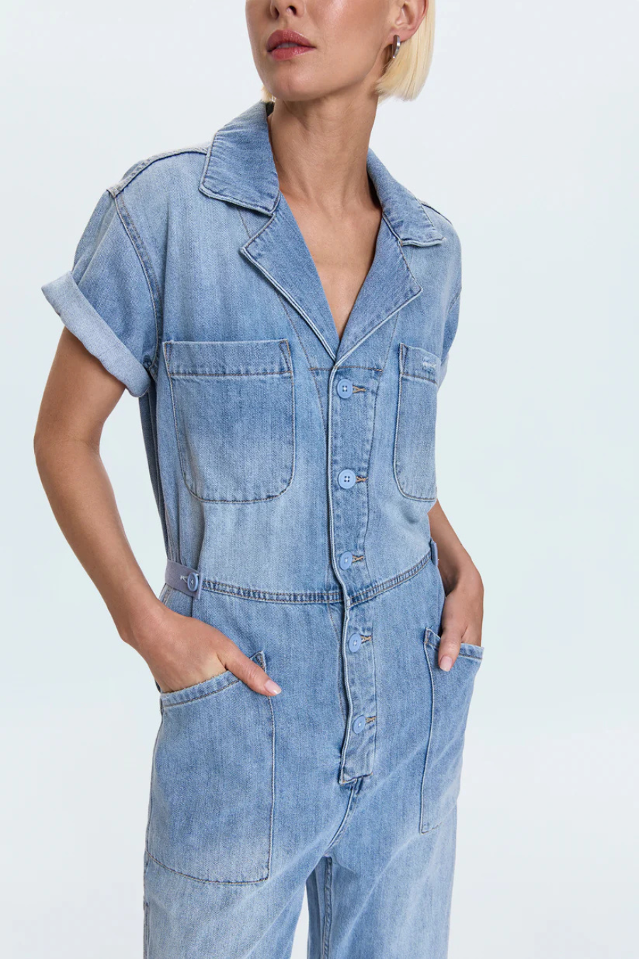 The Grover Jumpsuit is a best selling style, designed for a comfortable fit with a button up bodice and adjustable waist. Made with non-stretch medium blue denim, it features subtle fading and crisp finishes.