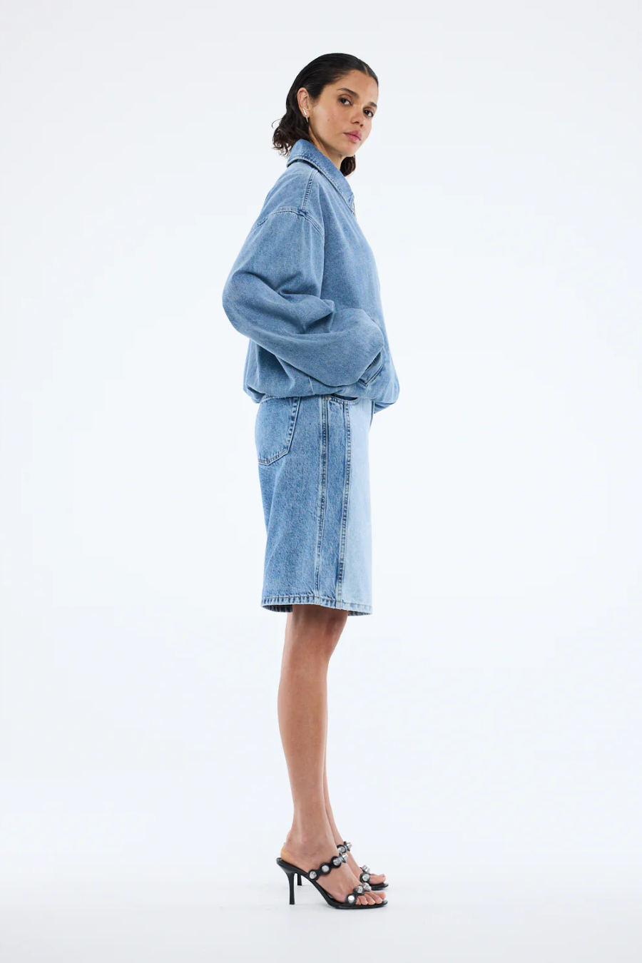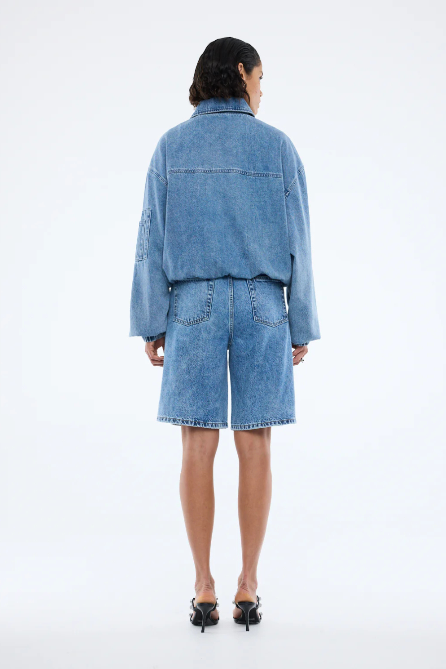 The harlow denim bomber in mid blue wash is made from stone-washed rigid indigo denim for a structured look. Featuring a zip front, cinched elastic cuffs, and angled welt pockets, it offers a fresh bomber silhouette.
