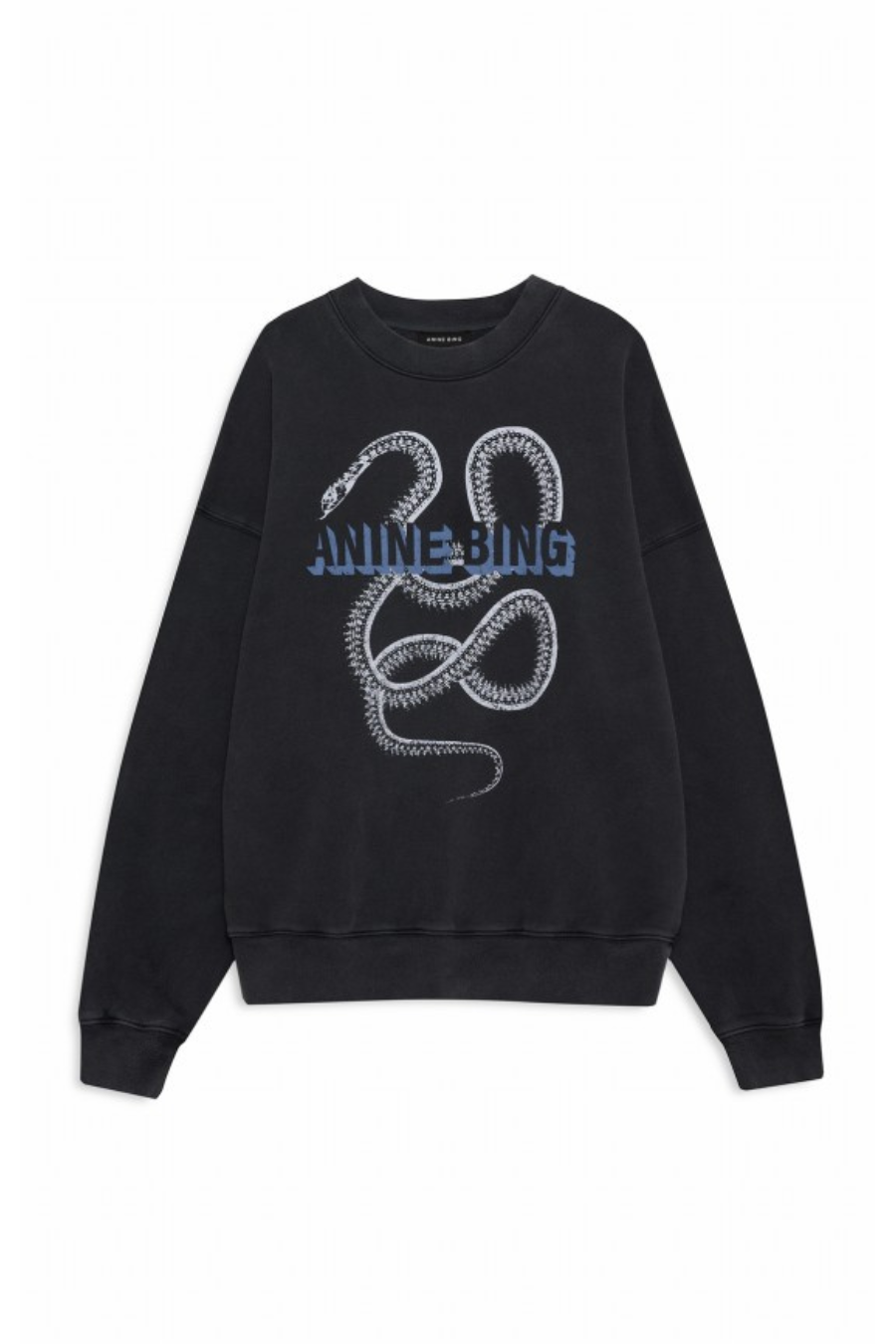 Harvey Snake sweatshirt from the Anine Bing collection. This sweatshirt has a relaxed, oversized fit. It features a design on the front: a large snake intertwined with the "Anine Bing" logo.