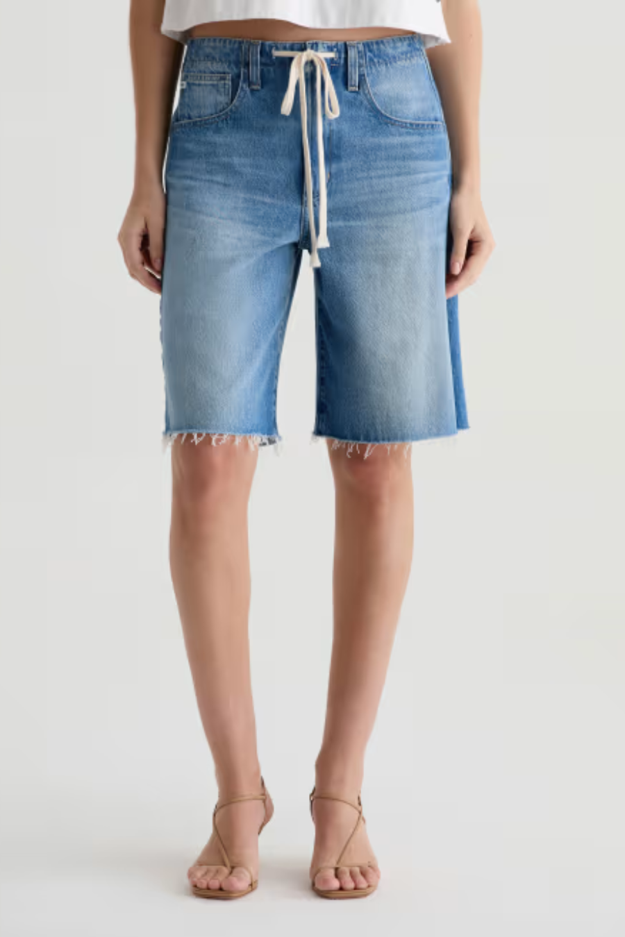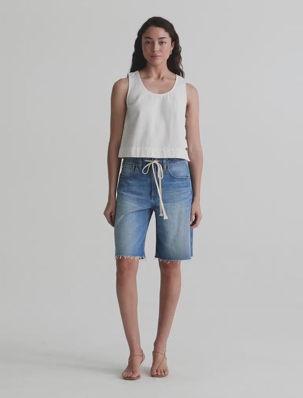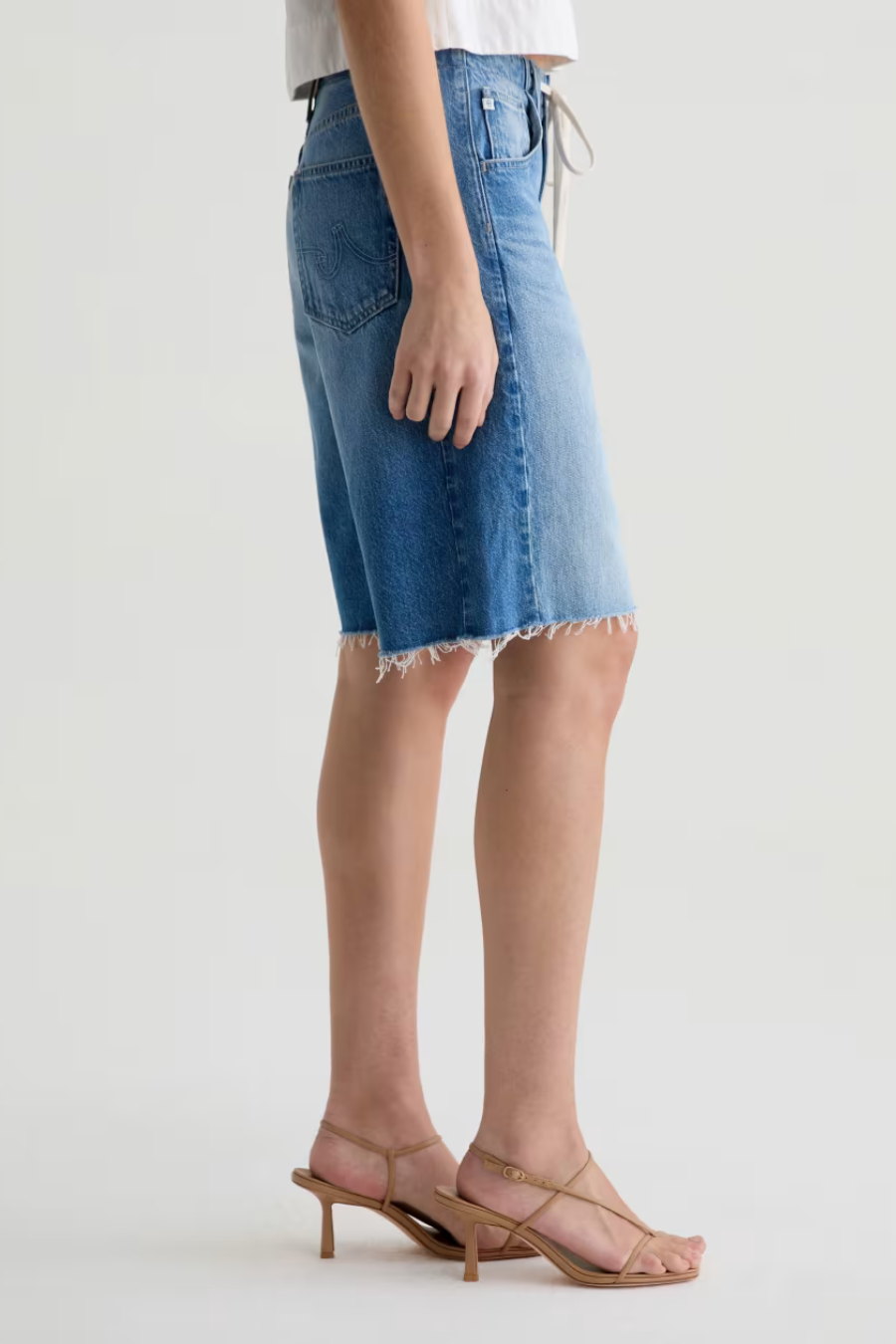 The Hattie Cinched Short is a high-rise Bermuda style with a 10.5” inseam and raw hems. Made from Italian non-stretch denim in a light wash, it offers a clean, structured look with a relaxed feel.
