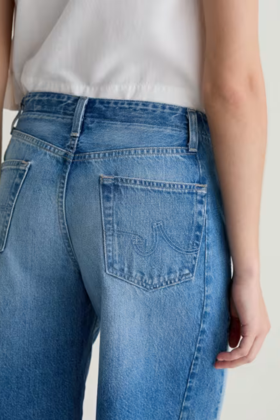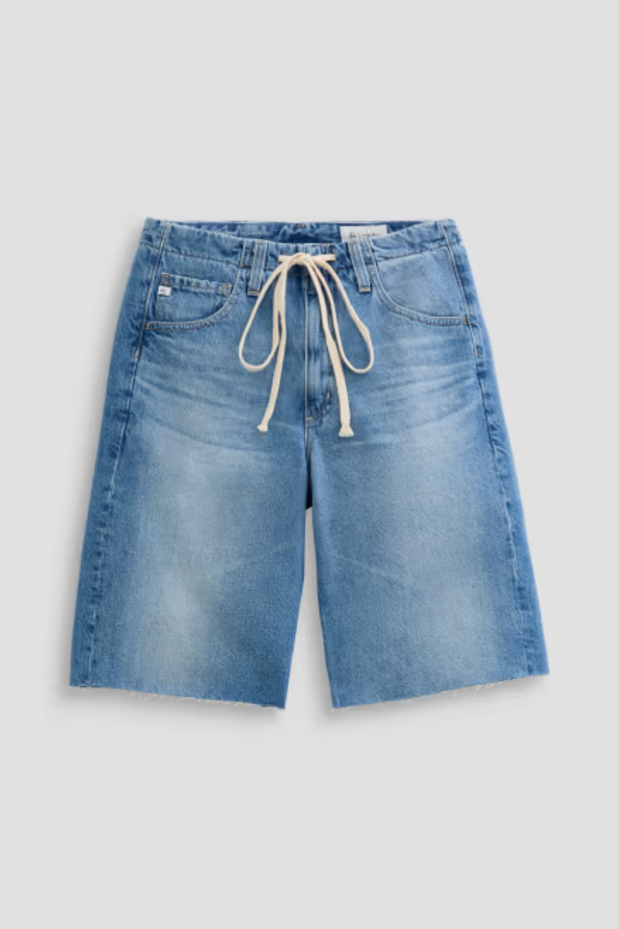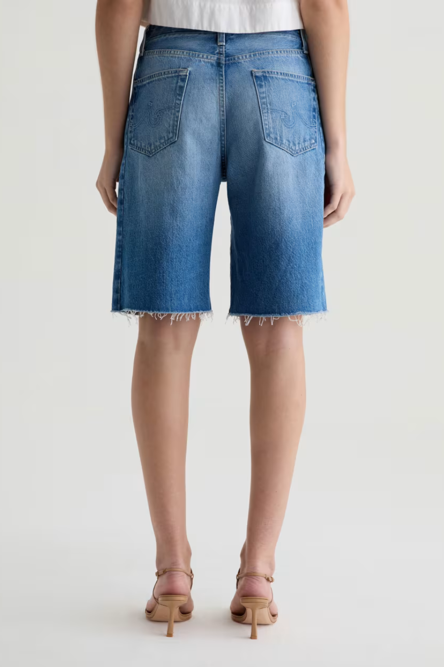 The Hattie Cinched Short is a high-rise Bermuda style with a 10.5” inseam and raw hems. Made from Italian non-stretch denim in a light wash, it offers a clean, structured look with a relaxed feel.