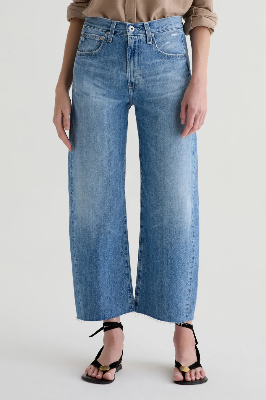 The Hattie Crop is a high-rise barrel made from non-stretch denim. In an AG-ed™ light wash to resemble 17 years of authentic wear, it is designed with raw hems, and offers a structured shape with a casual, lived-in finish.