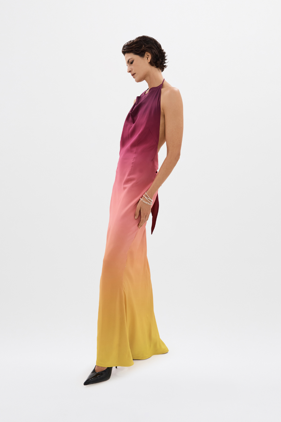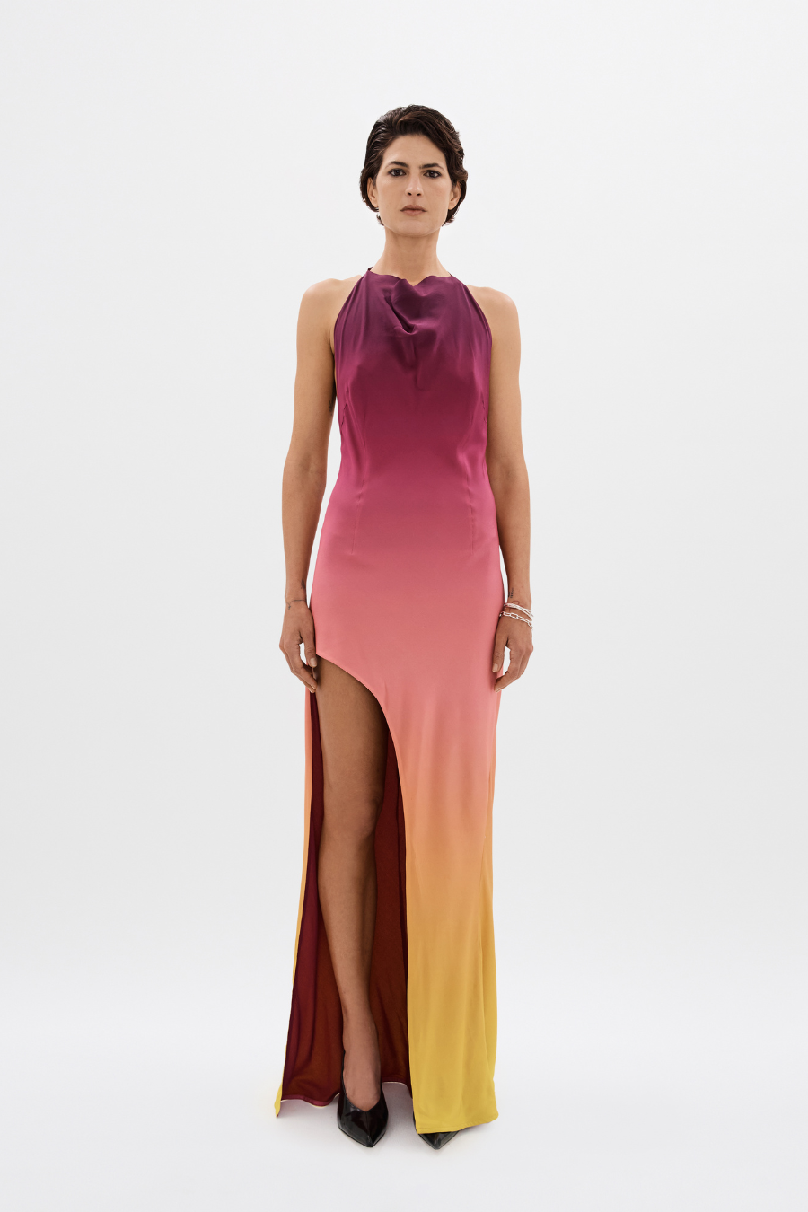 The Izar returns in our signature Havana Dawn Gradient. Both elegant & fluid, this low-back evening dress fades from midnight purple to vibrant daytime hues toward the hem. Set on 100% Organic silk with a signature contrast lining, the halter neckline that enhances the drape of the fabric, whilst the asymetrical design & low-back creates a sleek silhouette. This dress is designed for a dramatic yet refined look, making it ideal for evening events. The flowing fabric and gradient hues evoke a sunset-inspired palette, offering a luxurious and eye-catching style.
