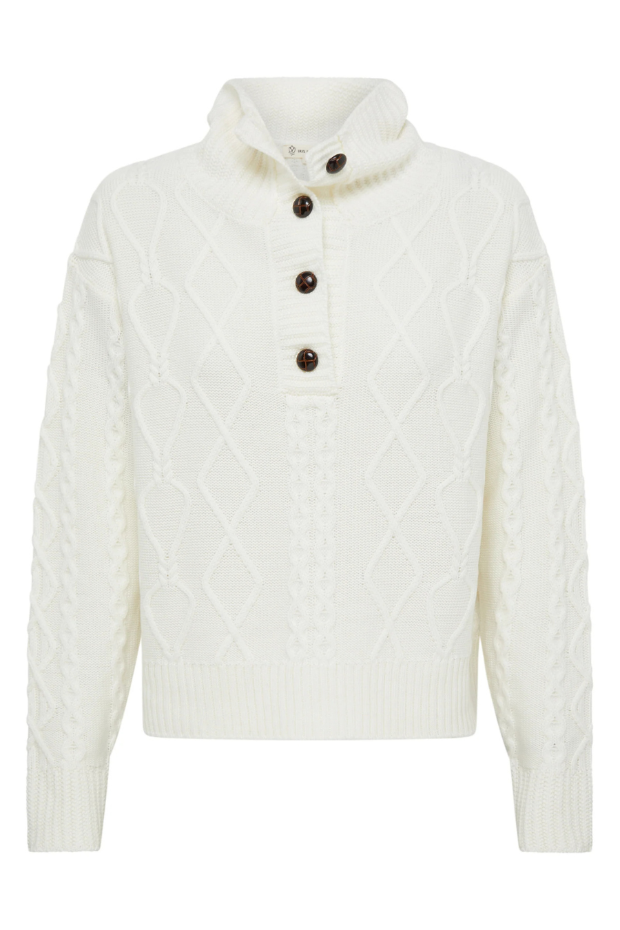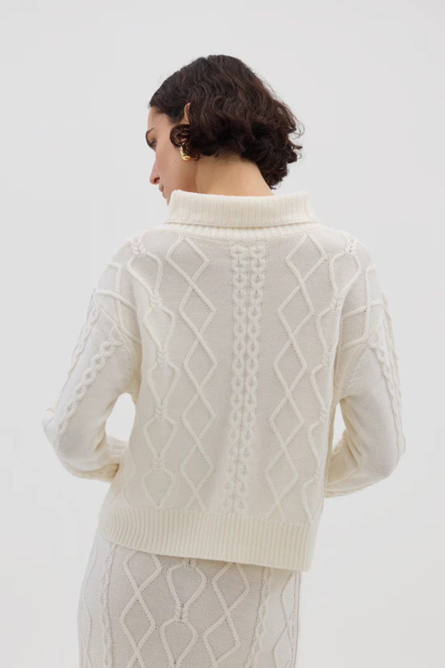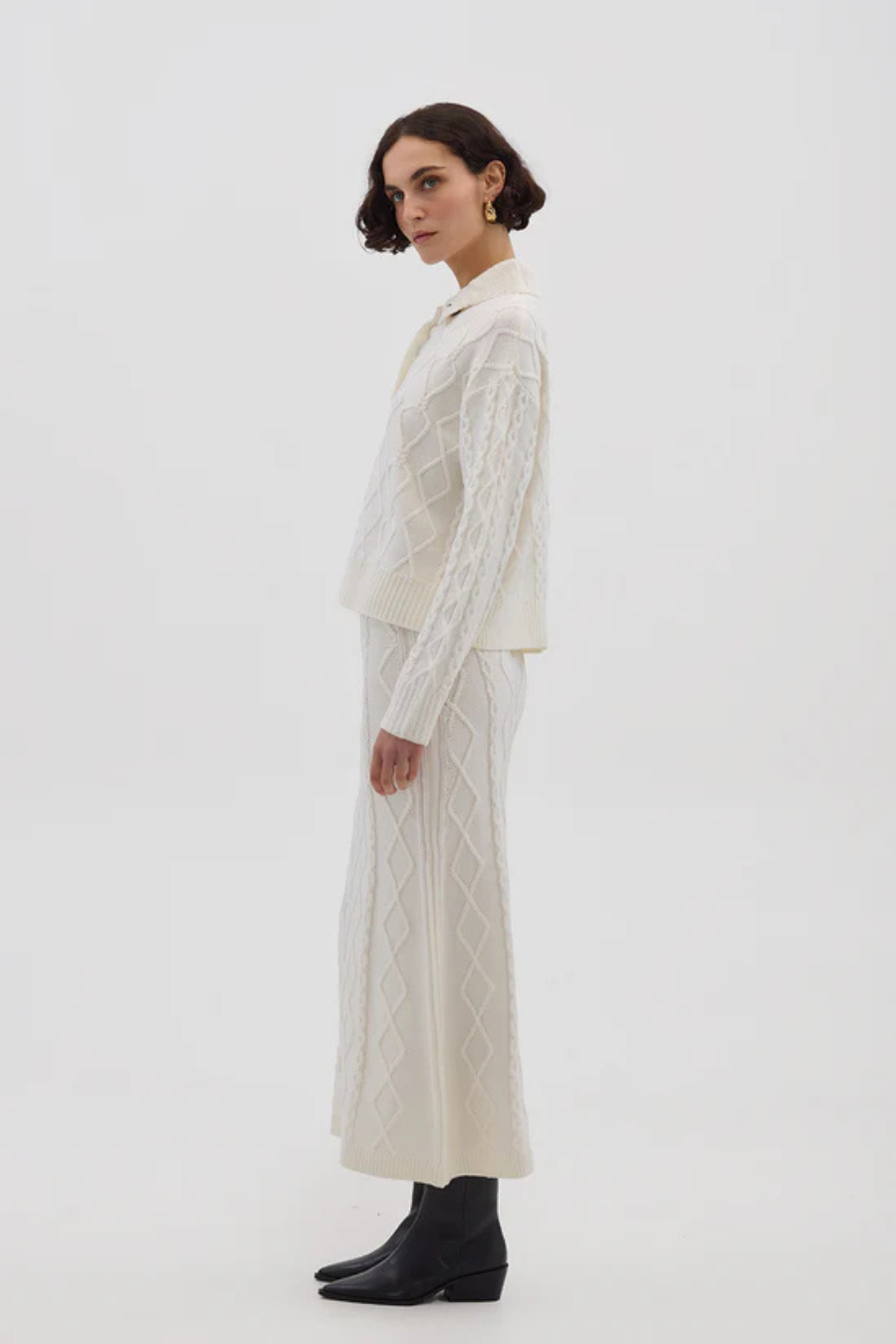 The Merino Sweater for Women in Cream is a classic layering piece, crafted from 100% Australian Merino wool for natural warmth, softness, and breathability. This ladies wool sweater features a button-neck silhouette and structured collar, adding a refined and elegant touch to its intricate diamond cable-knit texture.