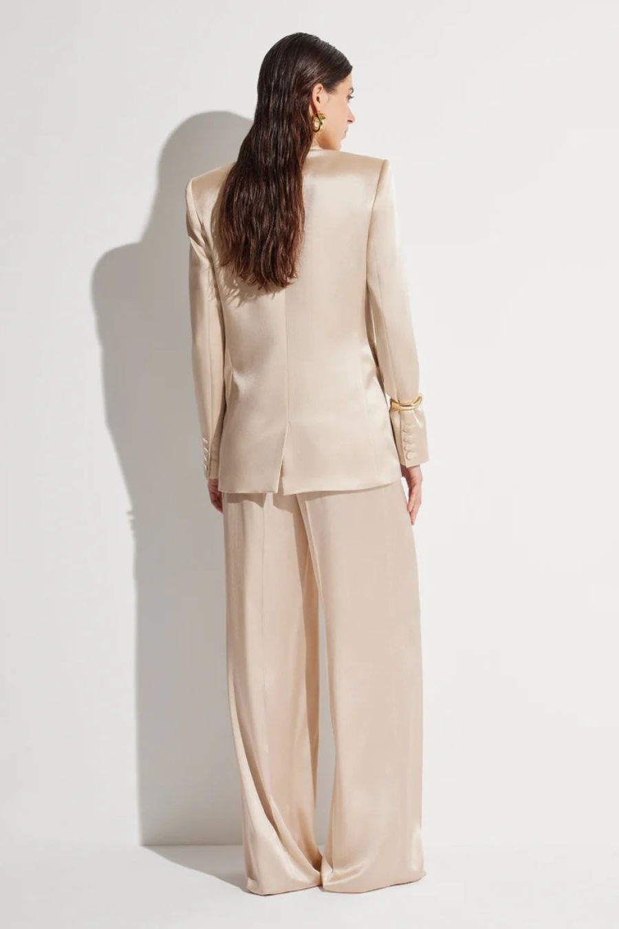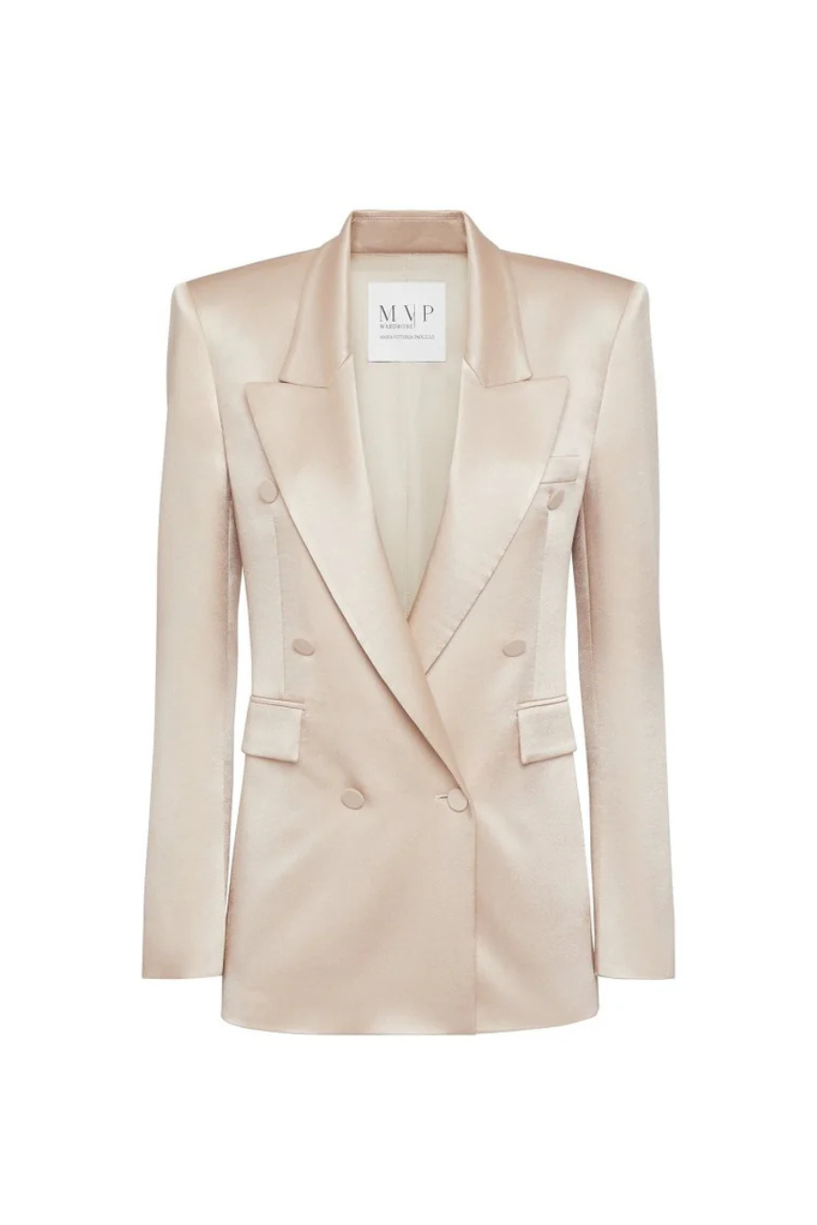 Double breasted jacket, fitted at the waist and wide lapel collar.