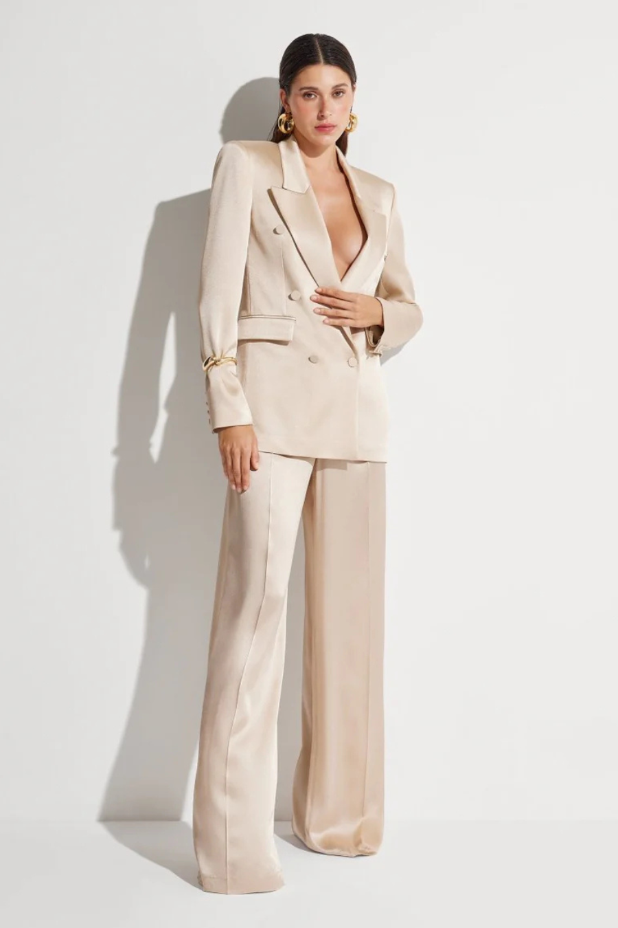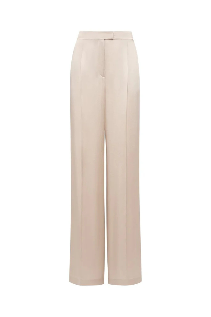 High waisted palazzo pants, side welt pockets and hidden zip and hook closure.