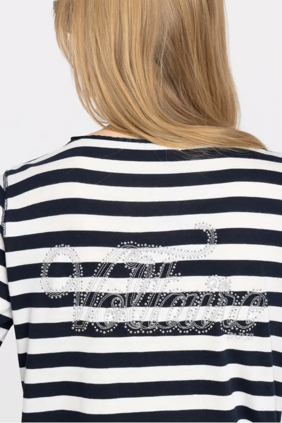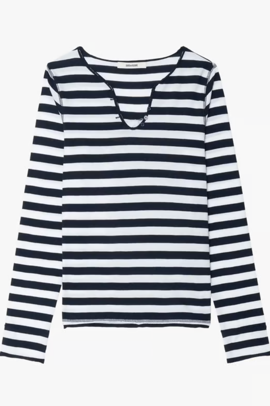 The Voltaire Tunisian T-shirt is crafted from 100% cotton, offering a soft, comfortable feel. Designed with a five-button Tunisian collar and long sleeves, it features a signature “Voltaire” rhinestone print on the back.