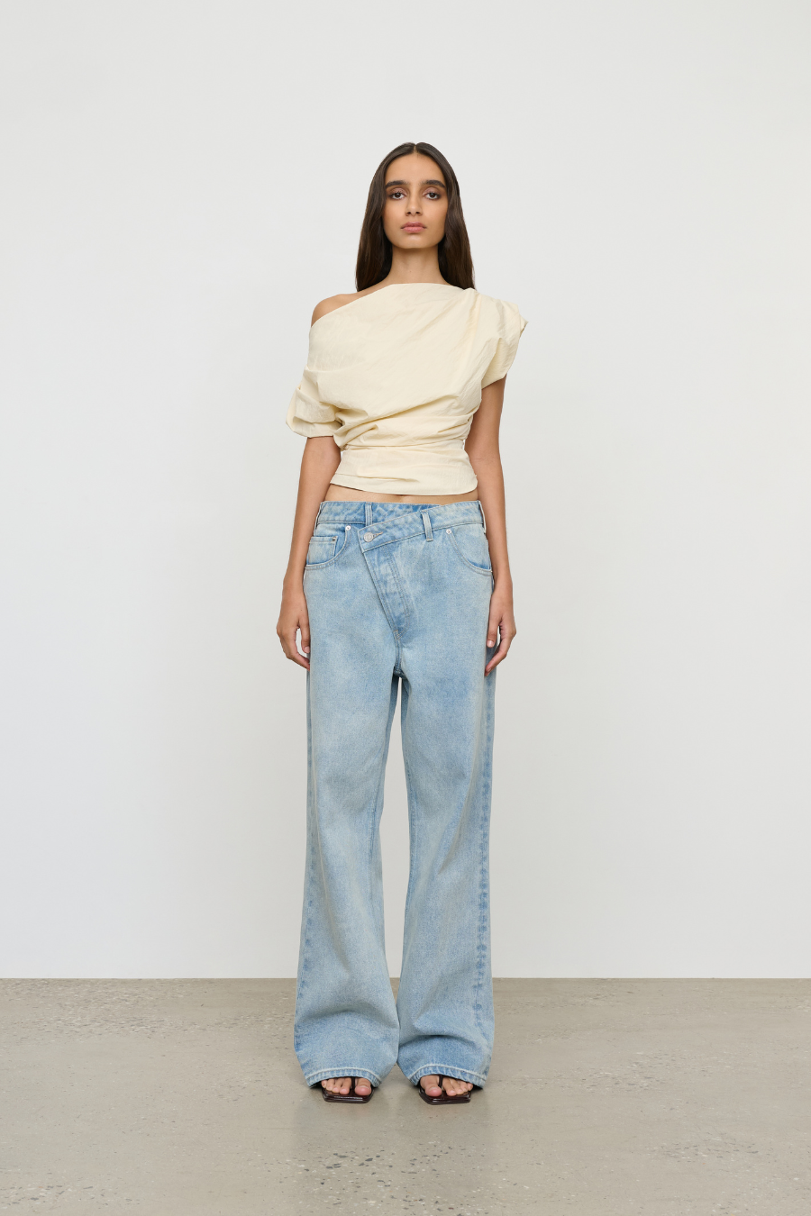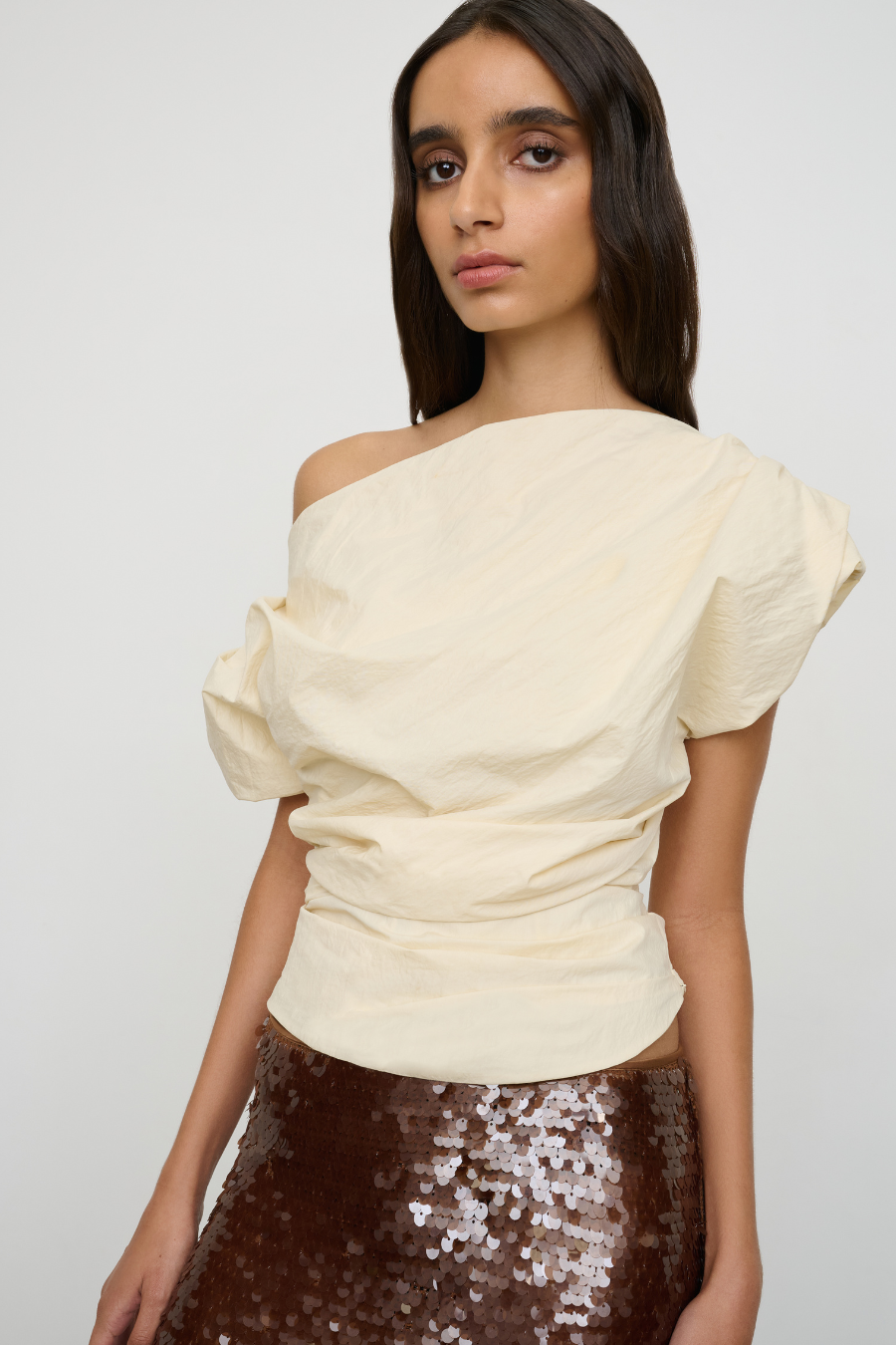 A draped, off shoulder top with asymmetric detailing in our signature lightweight nylon with soft drape.
