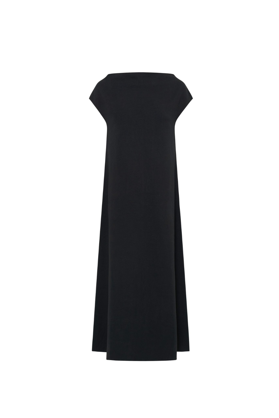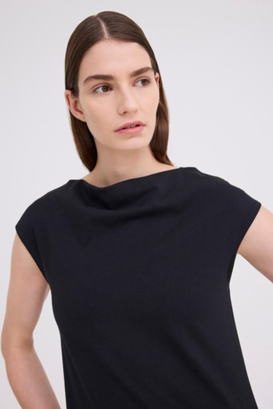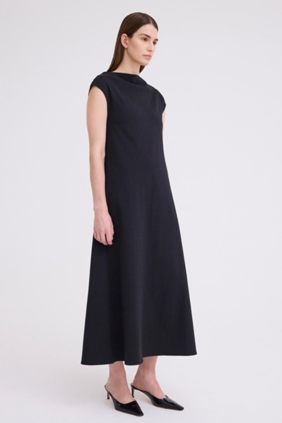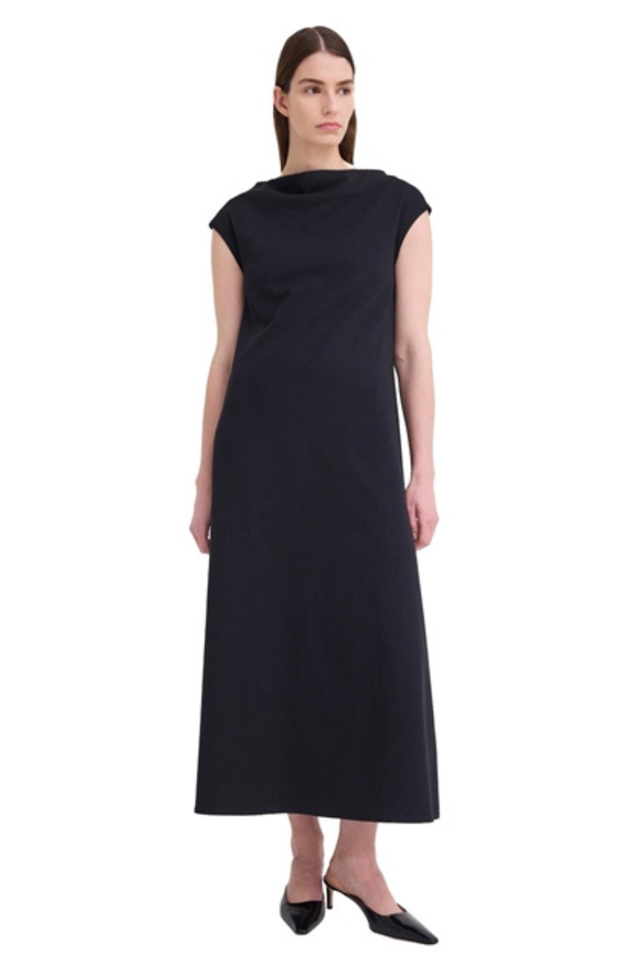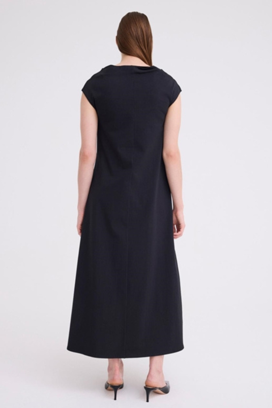 Effortlessly chic, this luxury jersey midi dress showcases an elegant neckline with a slight cowl detail. With a relaxed shape paired with elegant cap sleeve details and a subtle flare to the skirt, this sleek dress bring a sense of easy elegance.