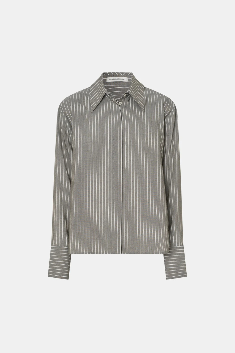 CAMILLA AND MARC Illias boxy stripe shirt with removable shoulder pads. Concealed button placket, box pleat at centre back. Rolled hem.