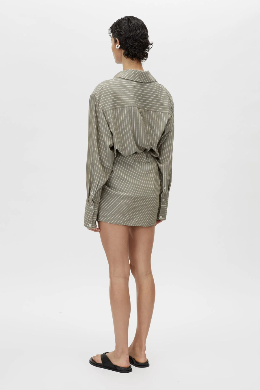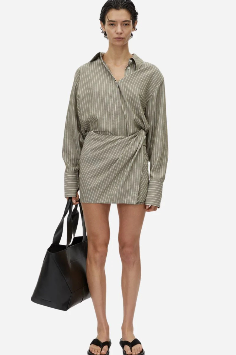 CAMILLA AND MARC Illias stripe mini skirt. Twist drape detail, split at centre front. Bound hem.