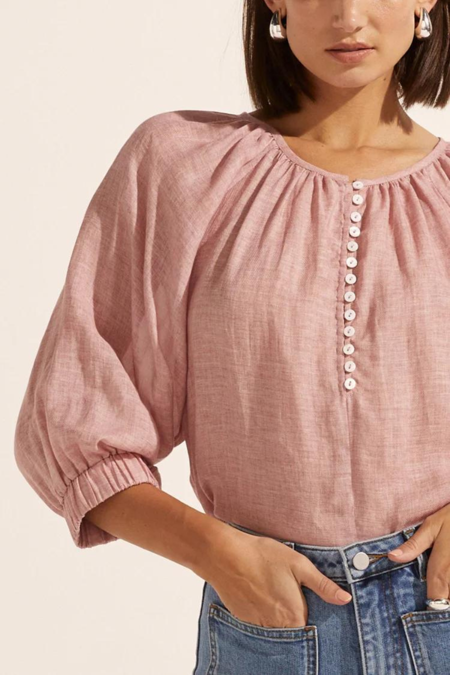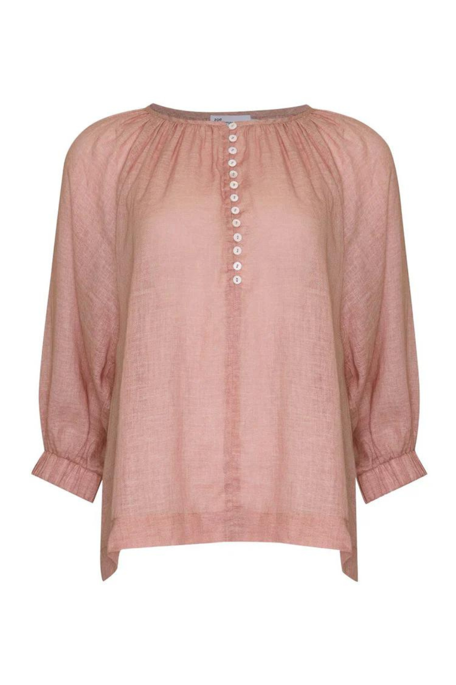 A gathered neckline leads into small shell buttons for a subtle and natural finish, a raglan sleeve is finished with an elasticated cuff for styling options of wearing it above or below the elbow
