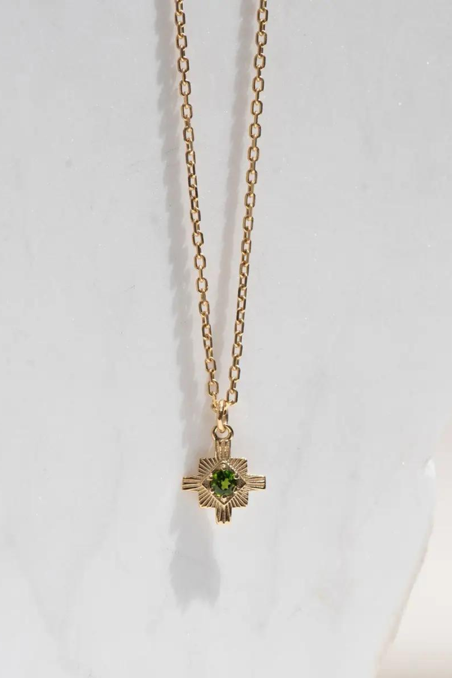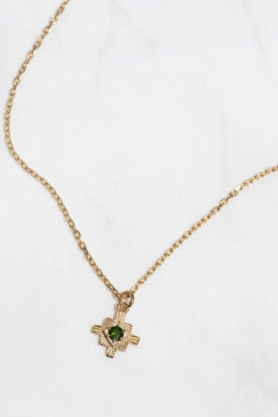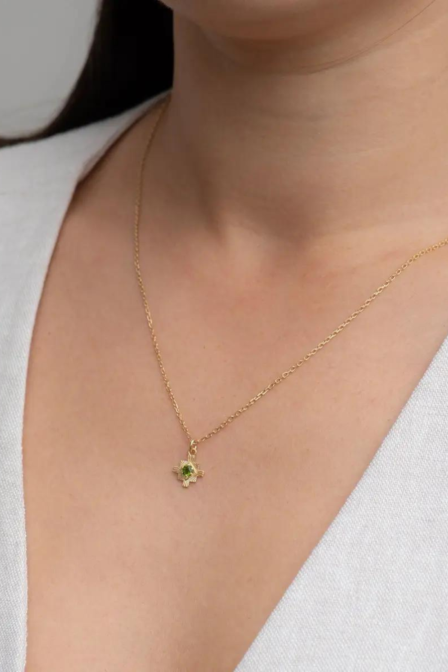Nestled at the heart of the necklace lies a radiant Chrome Diopside gem, a shimmering tribute to the verdant landscapes and vibrant energy of the Andes. Like a hidden gem waiting to be discovered, the Chrome Diopside captures the essence of the natural world, infusing the necklace with a touch of luminous beauty.