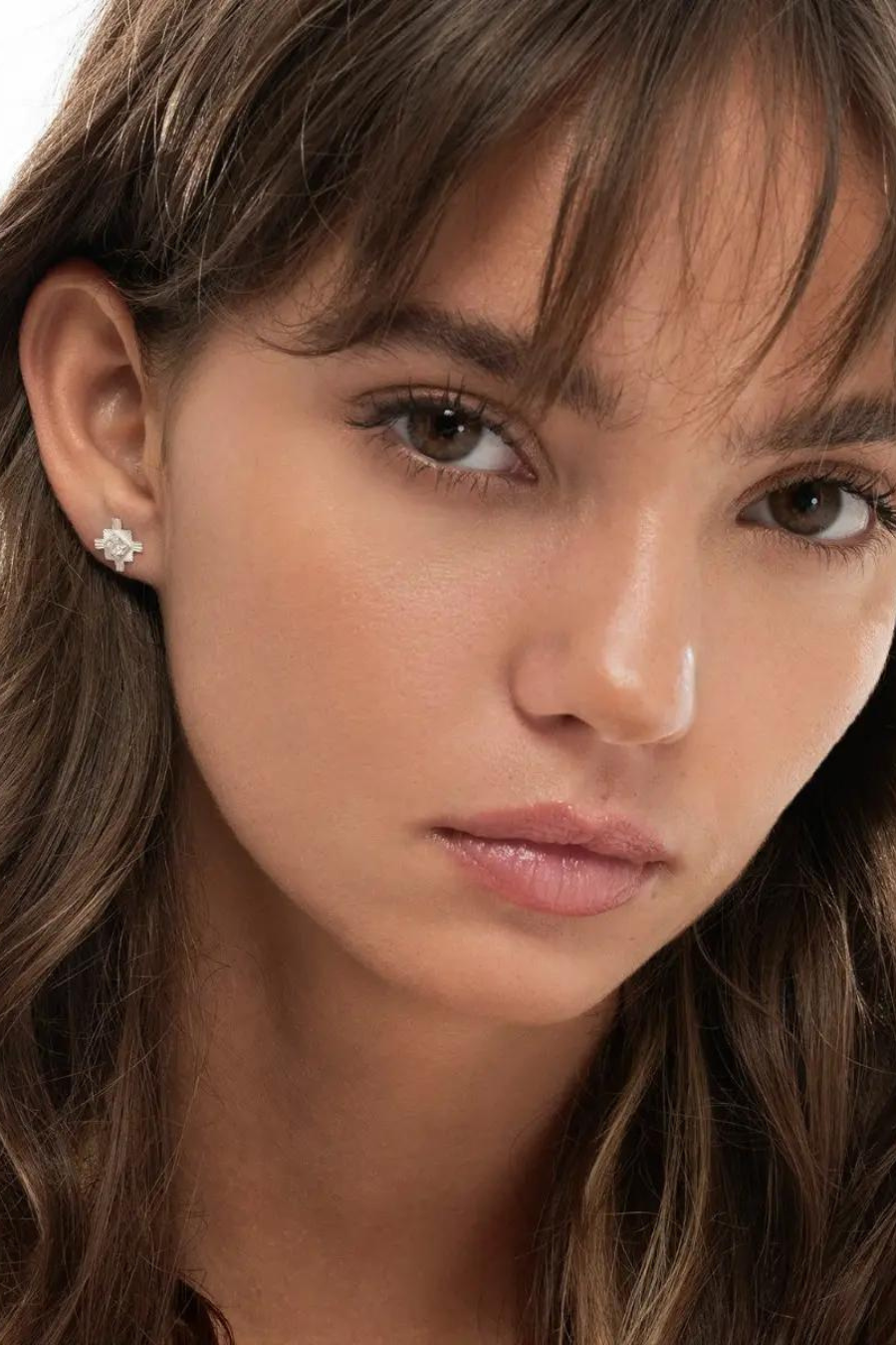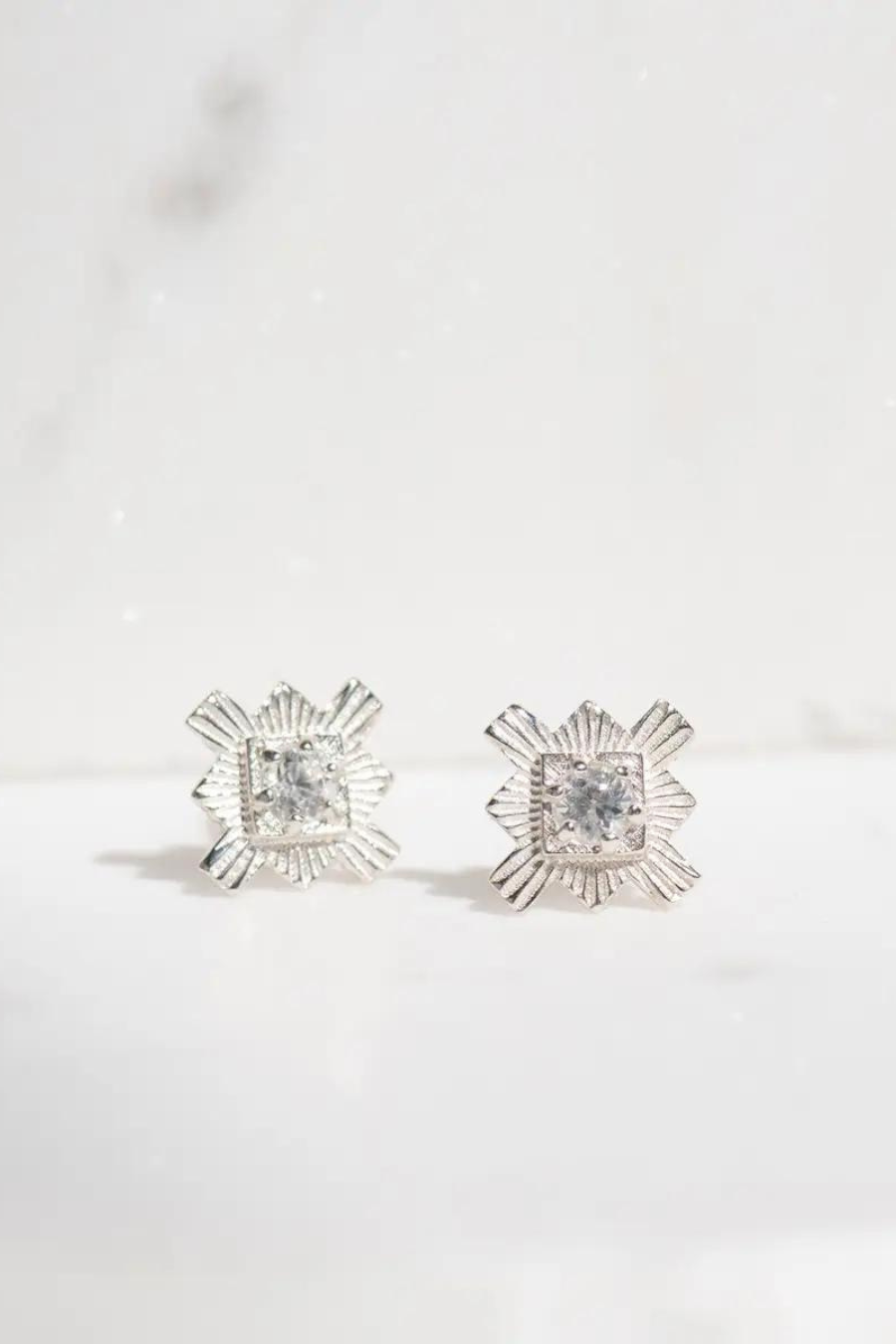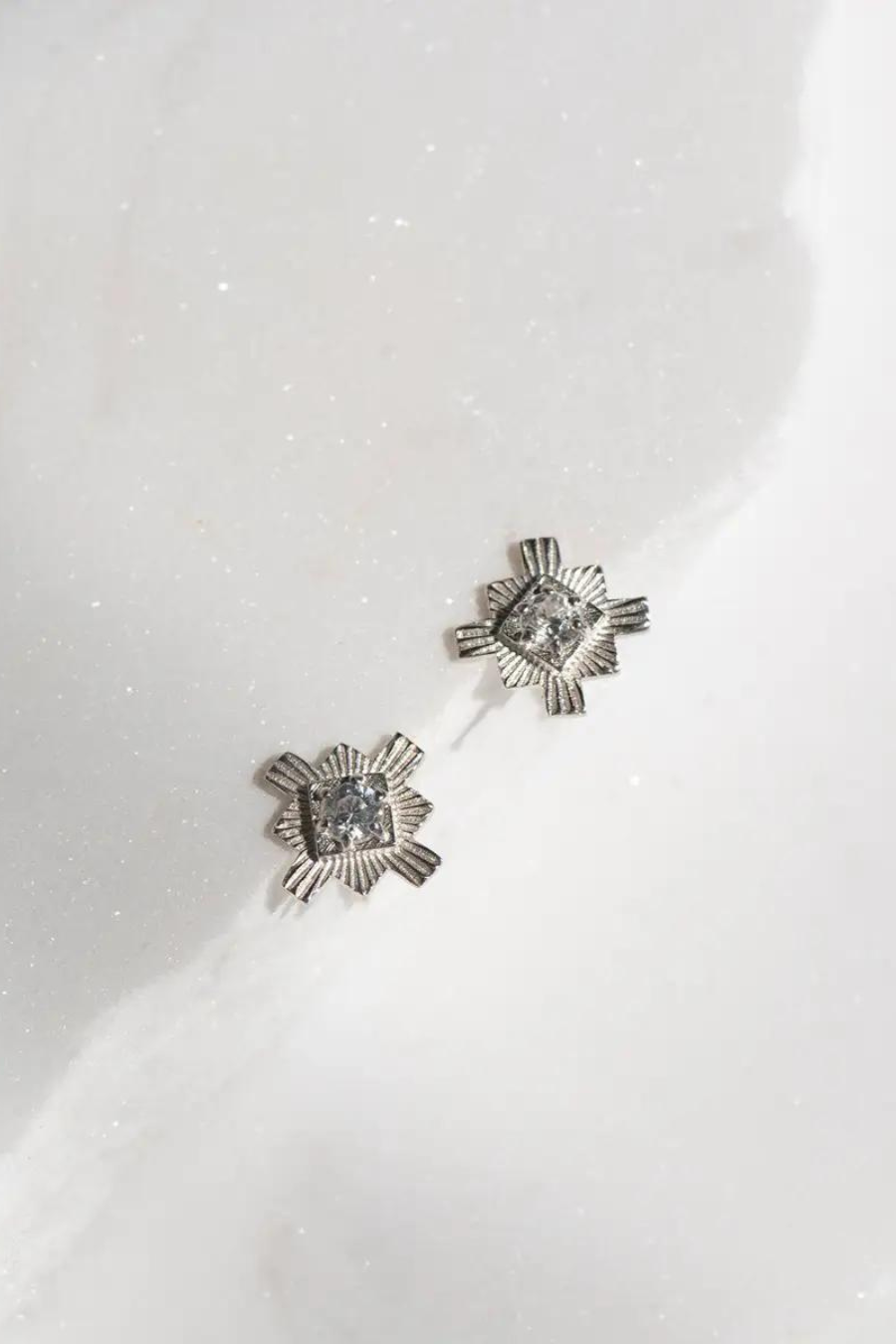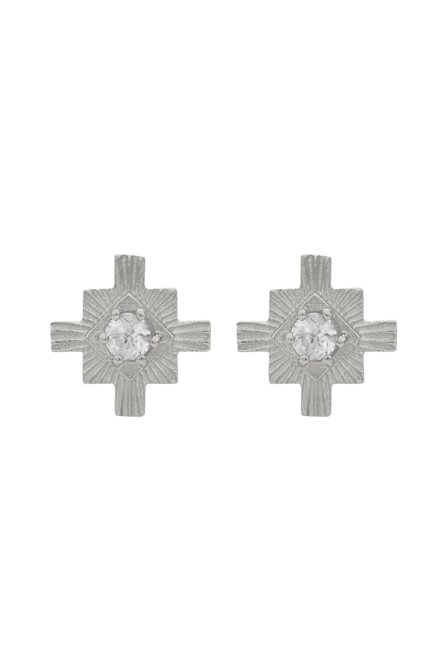 Inka is an elegant stud with a small stone nestled into the centre. Inspired by the strong focus on the 4 directions – commonly referred to as the compass points in Native American culture. Particularly in Inca culture, there are various manifestations of these types of forms. These earrings are a homage to the more simple form of compass points and the symbol of orientation.