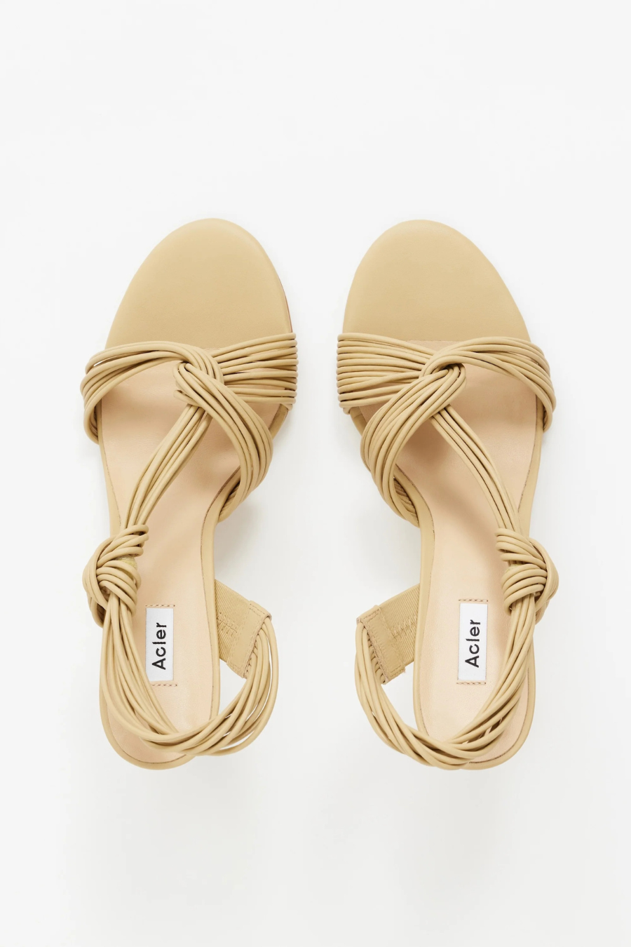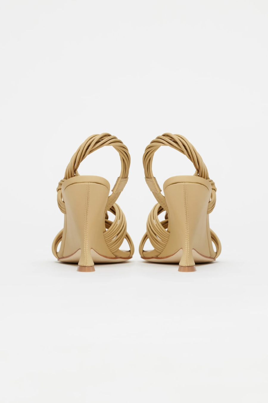 A modern statement piece, the Iverly Knot Wedge in Biscuit merges intricate design with contemporary flair. Crafted from cow leather, the knotted straps add visual intrigue, while the sculpted 10cm wedge elevates both your style and height. With an elasticated side for easy wear, this bold silhouette is ideal for those seeking both comfort and impact.