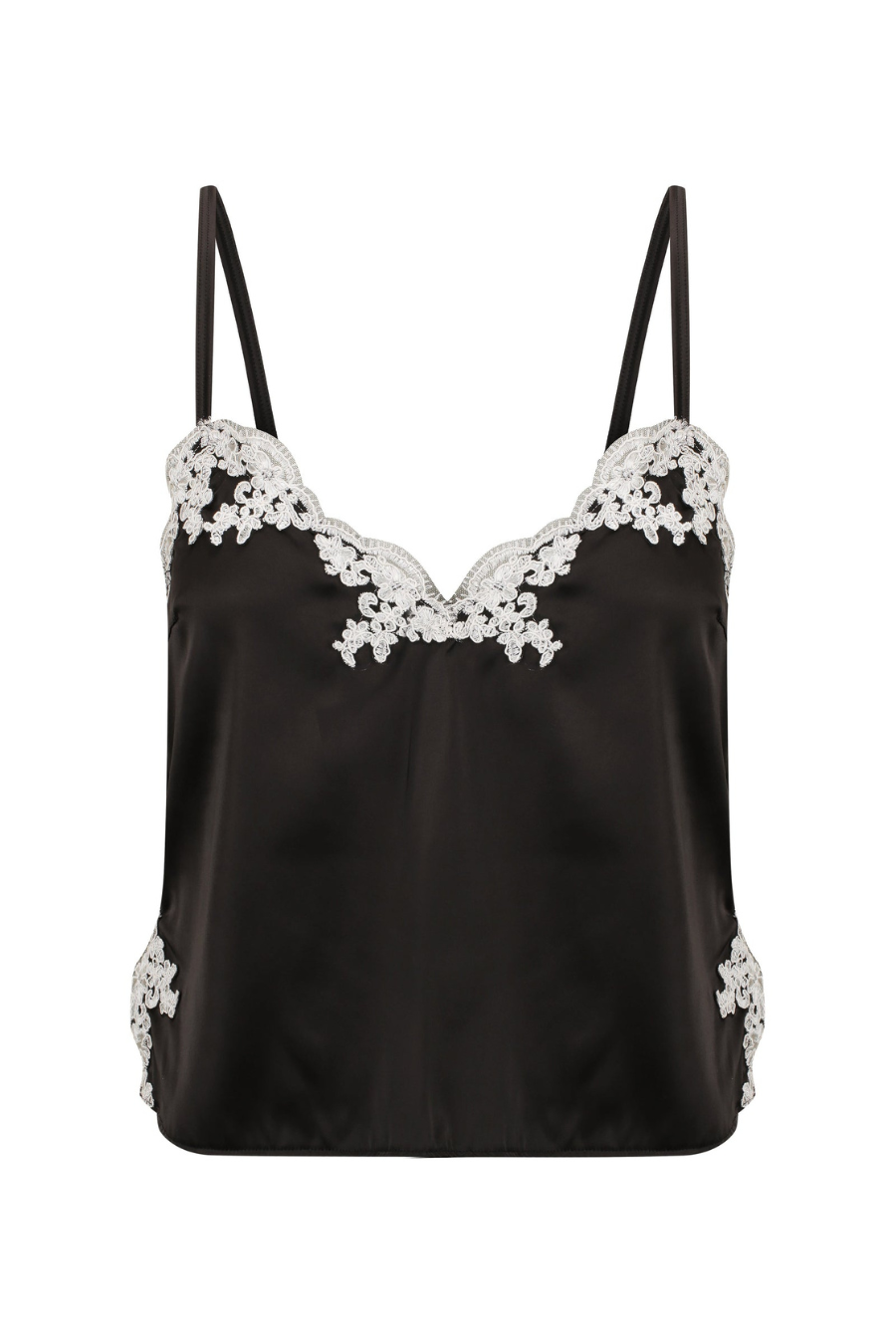 The Jean Camisole in Black captures the timeless romance of vintage lace reimagined in our new soft satin. Detailed with contrasting lace trims and a subtle v shape at the front and back for an elegant silhouette.
