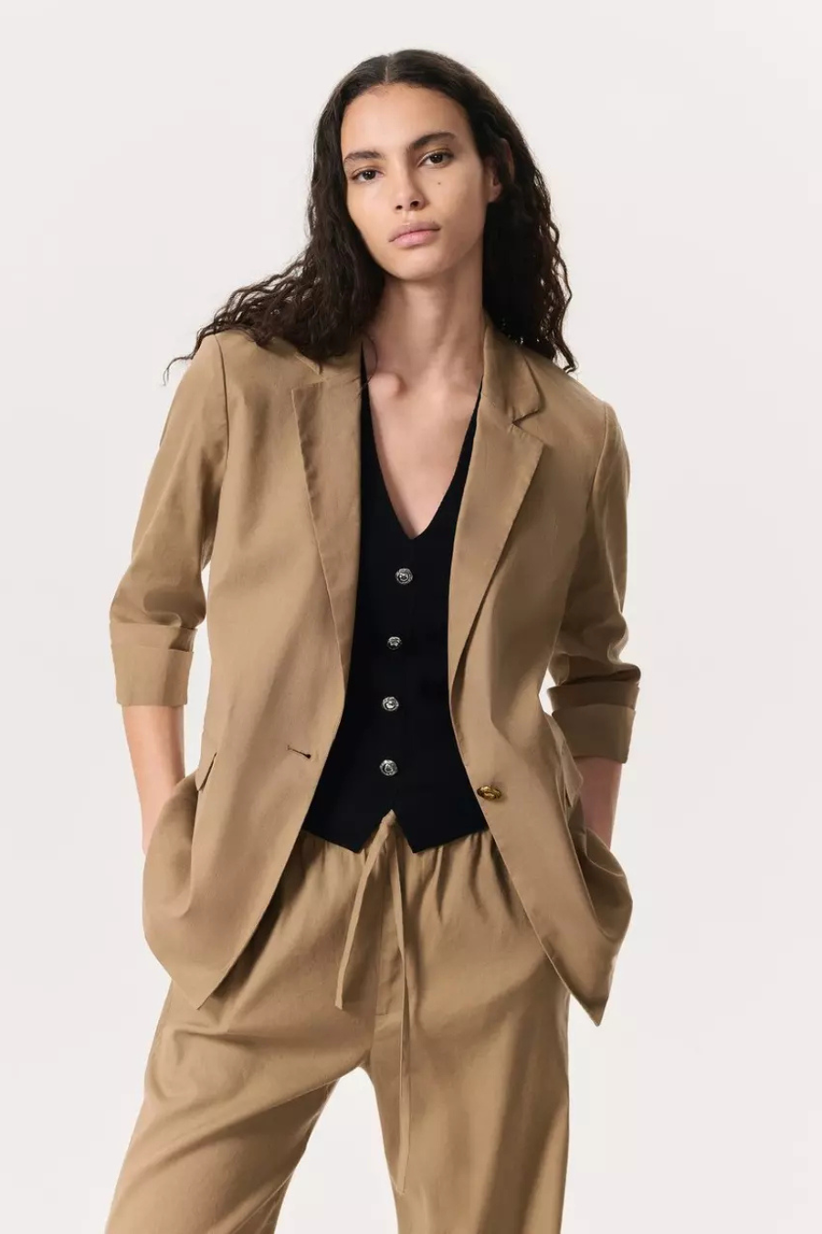 The kind of wear-with-everything wardrobe essential that looks polished, but feels effortless. This classic-fit blazer is tailored from an airy linen blend and secures with a single, vintage-inspired metal button. Its three-quarter sleeves are perfectly cuffed to complete its laid-back look.