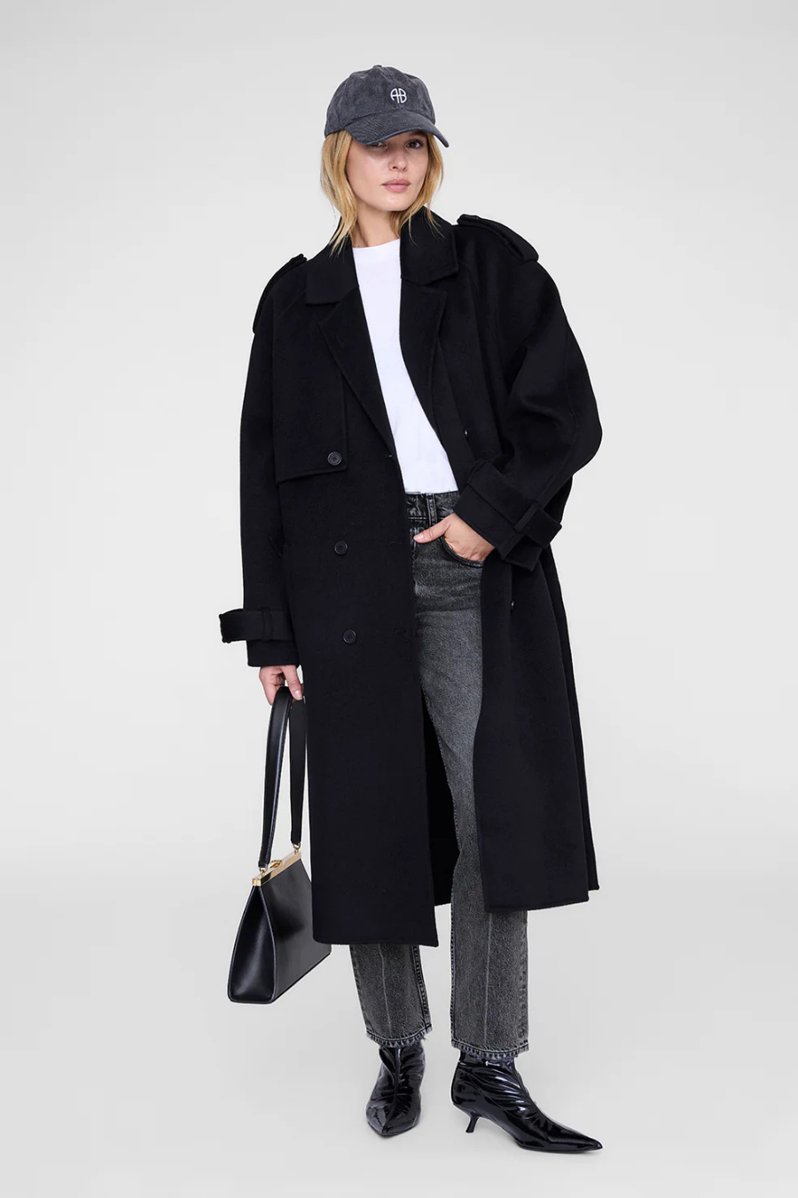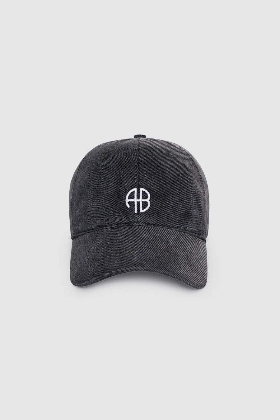 An everyday cotton denim hat in washed black with contrast white stitching and embroidered ANINE BING logo at front. - Cotton denim - One size - Adjustable back strap - Navy embroidered logo Please note: This item is handcrafted and will vary in color or appearance.
