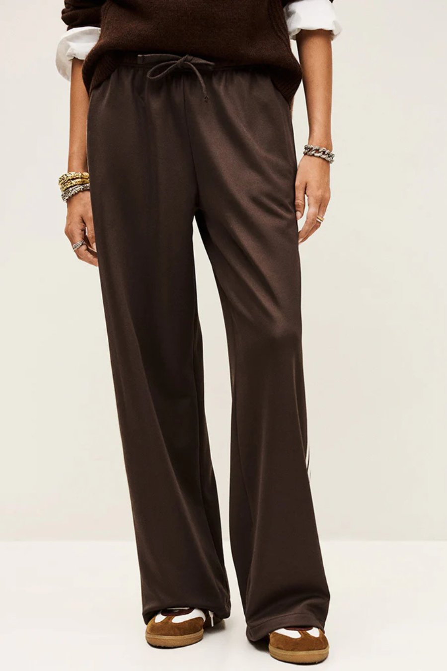 These pants channel a vintage 1980s vibe with their bold striped design and soft polyjersey fabric, offering both comfort and style. A knit jersey stripe runs down the sides, accentuated by a contrasting zipper that highlights the retro-inspired look. The elastic waist is finished with a unique brown cotton panel at the front and string detailing, while the drawstring hems allow for a puffed effect that adds extra character. Designed with straight, wide legs, these pants are a statement piece that blends relaxed ease with standout details.