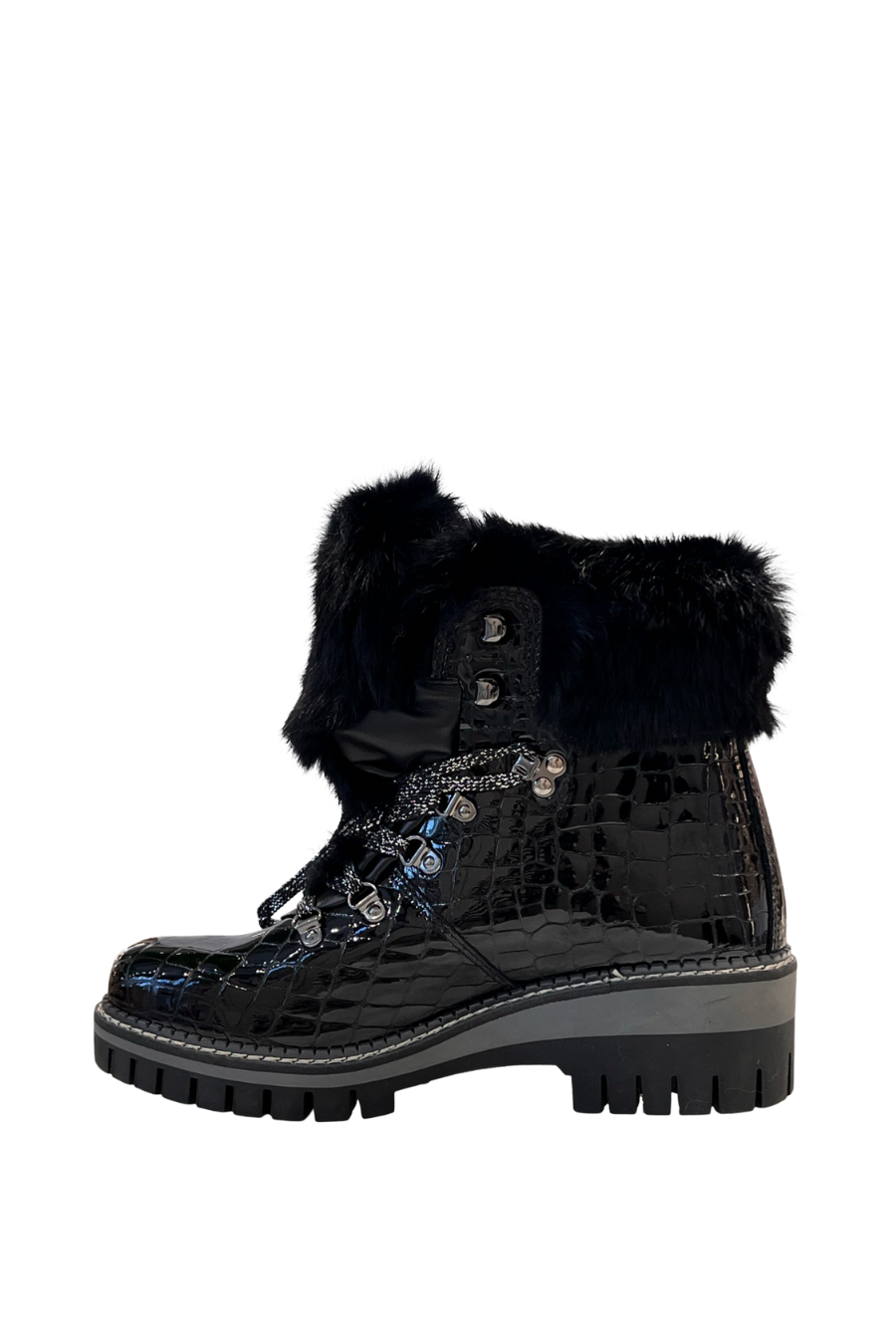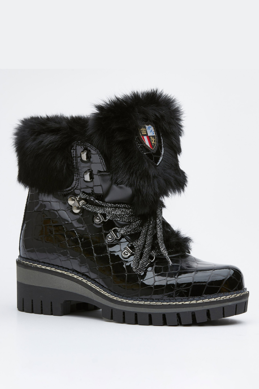 Lace-up ankle boot in black patent crocodile print calfskin with black Rabbit fur collar.