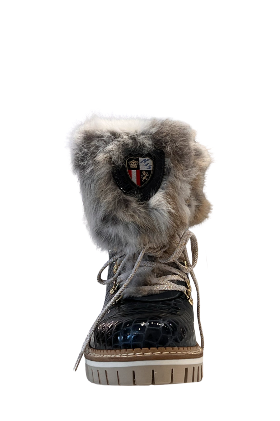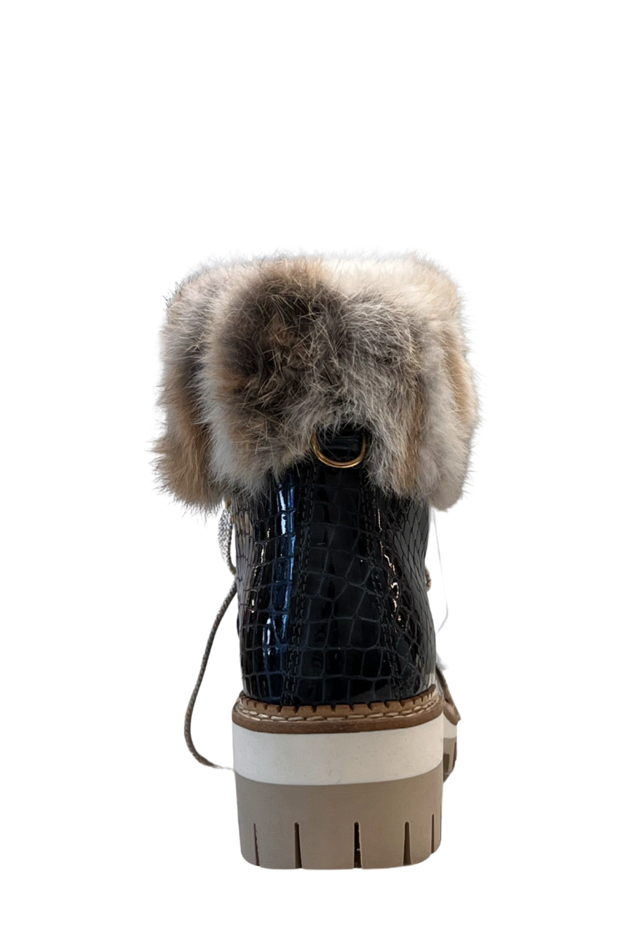 Lace-up ankle boot in blue patent crocodile print calfskin with Rabbit fur collar.