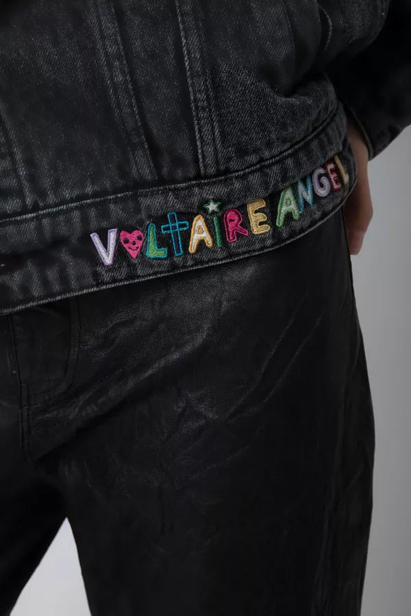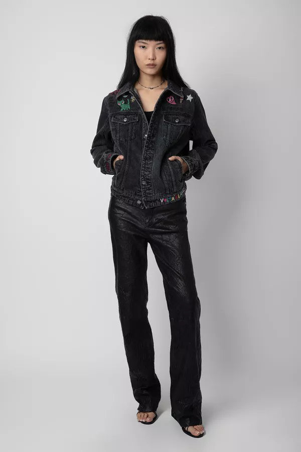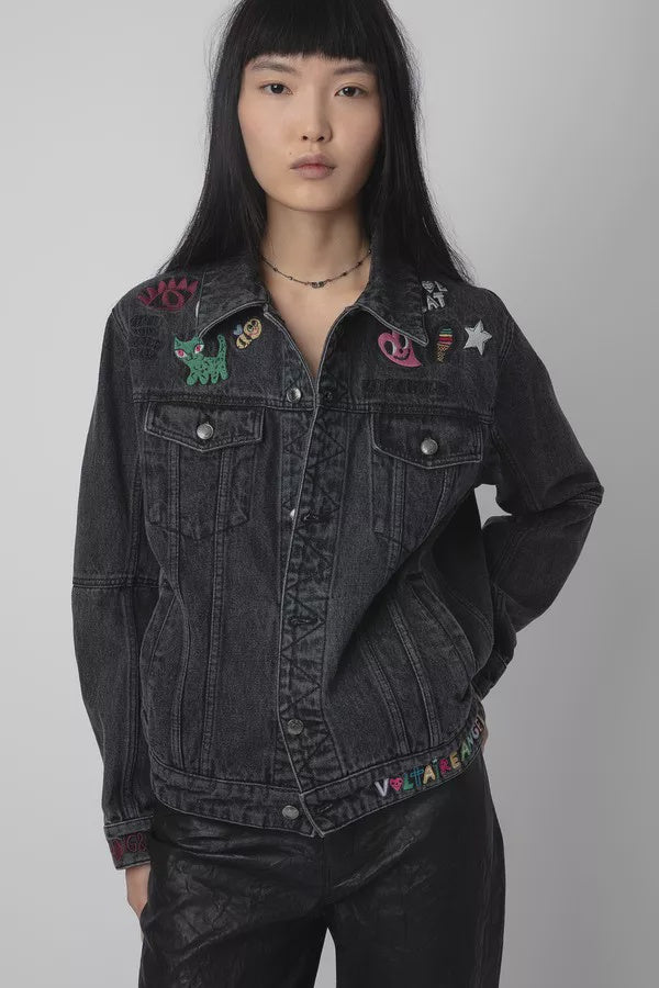 Grey denim oversized jacket with embroidered motifs and overstitching.