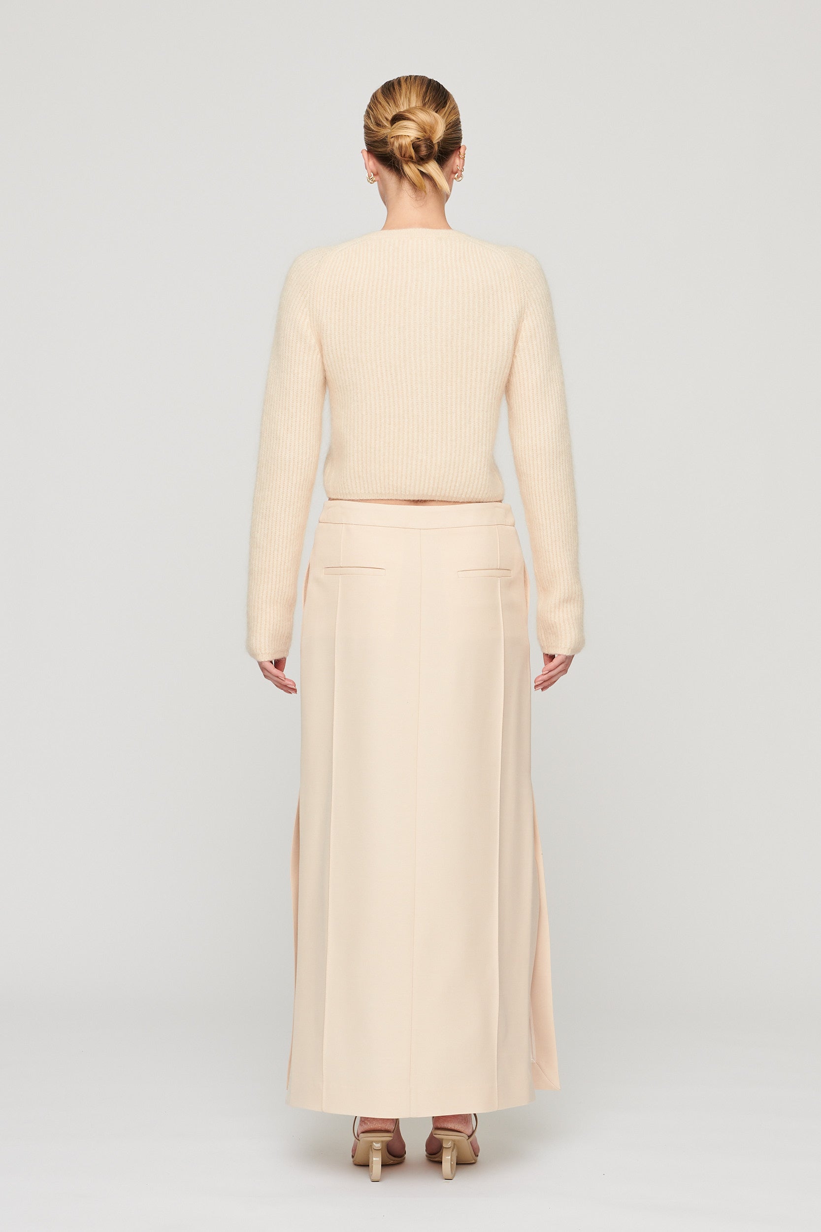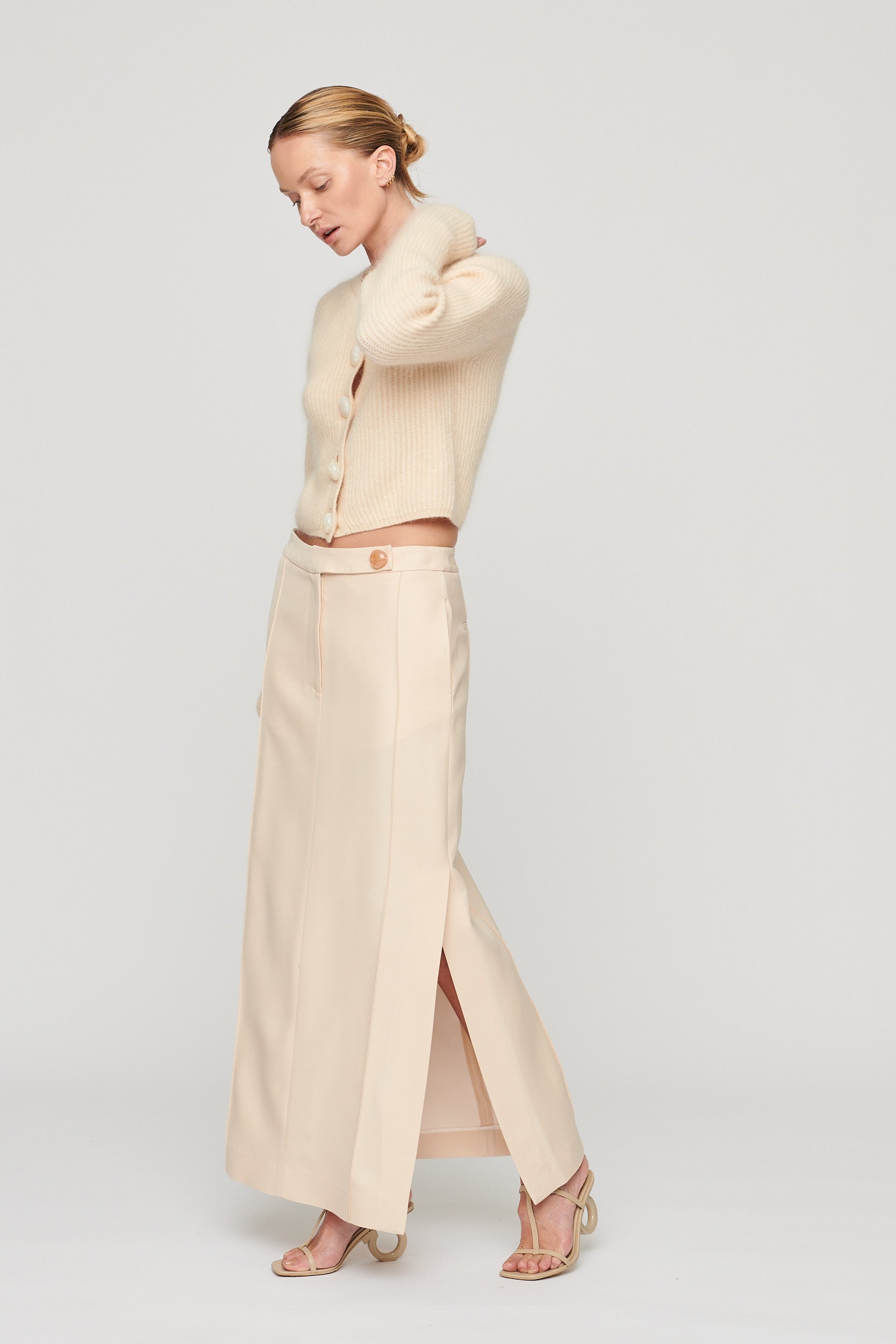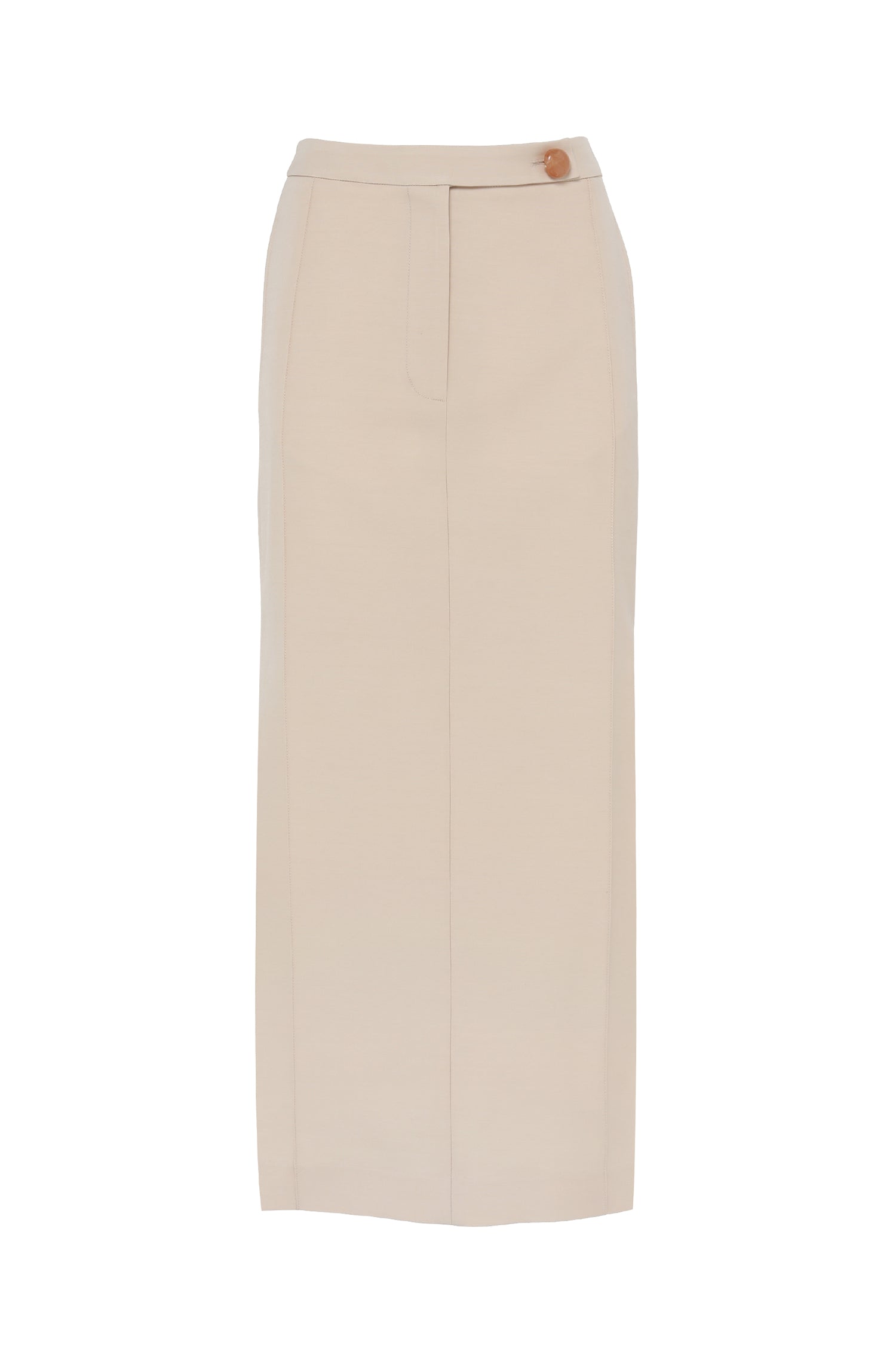 This Kingston Pintuck Skirt Macadamia features a straight midi length with splits on each side. For a sophisticated look, pair it with the matching Holland Blazer.k.