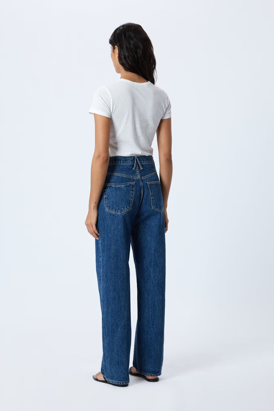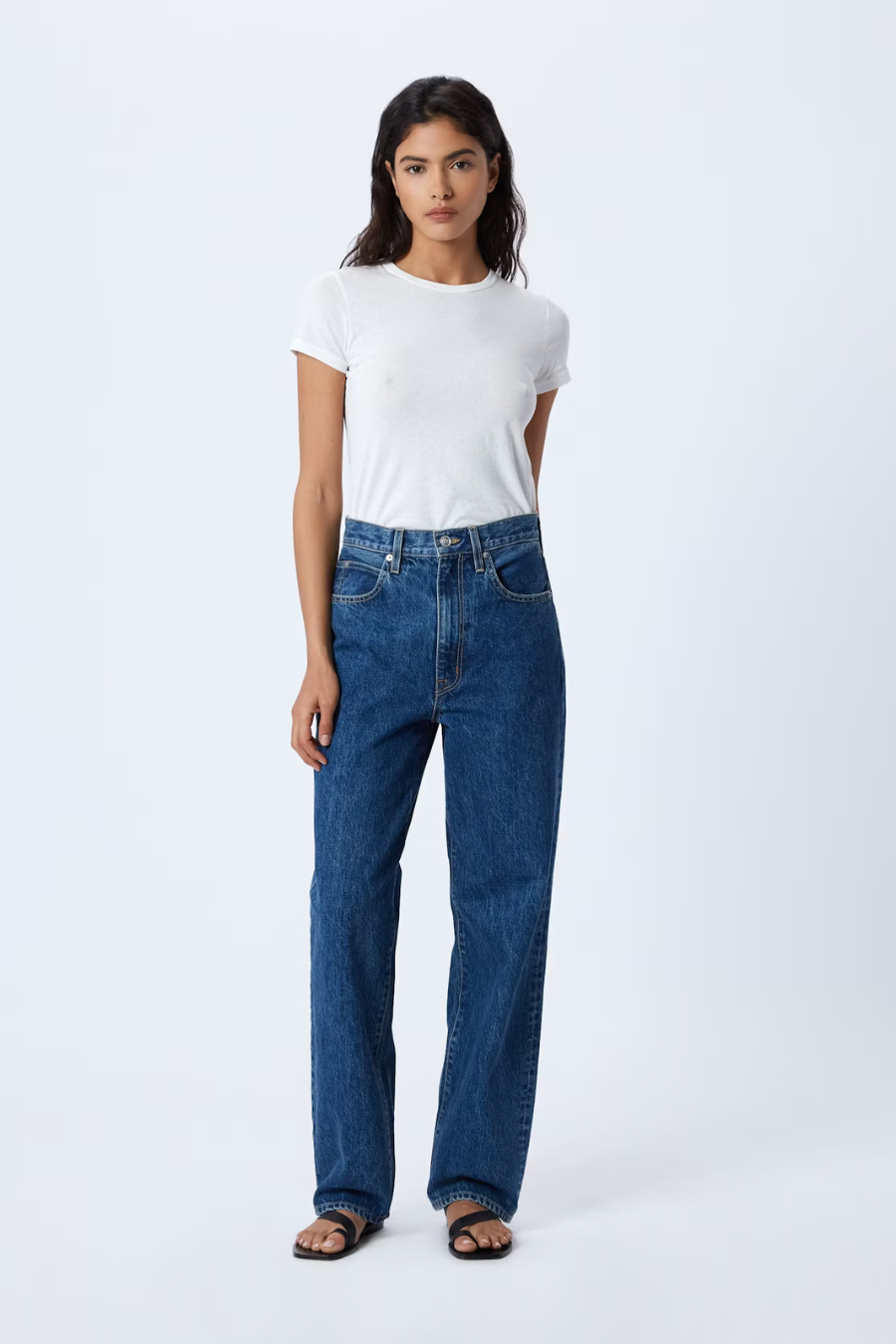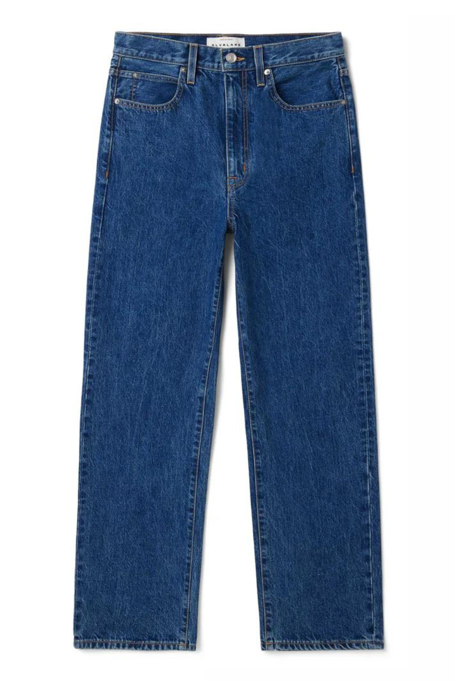 Crafted from pure cotton fabric and designed with a high rise and straight tapered leg.