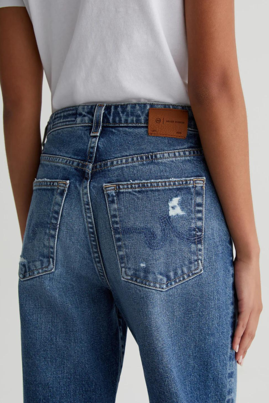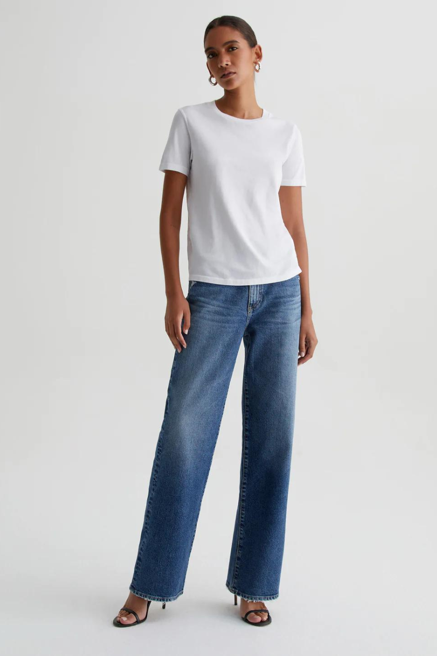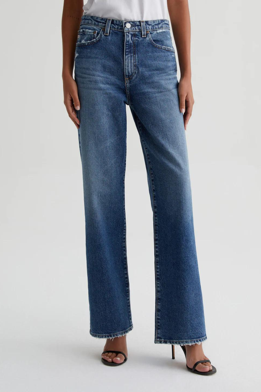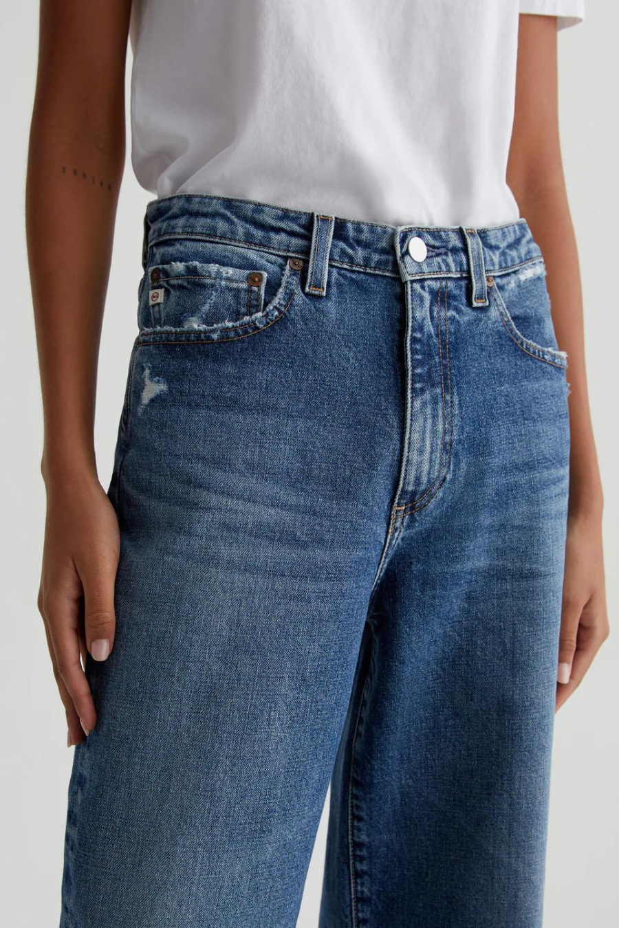 The Kora wide-leg jeans have a waist-hugging high rise and a loose fit through the legs, creating a must-have silhouette. This pair is featured here in an AGed™ medium blue wash with faded details, subtle fraying at the hems, and a bit of distressing around the pockets to emulate 15 years of wear. It's made from 11 oz. 360° Denim with vintage bi-stretch for enhanced comfort.