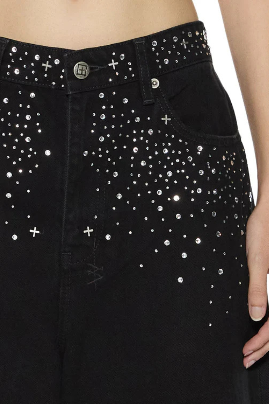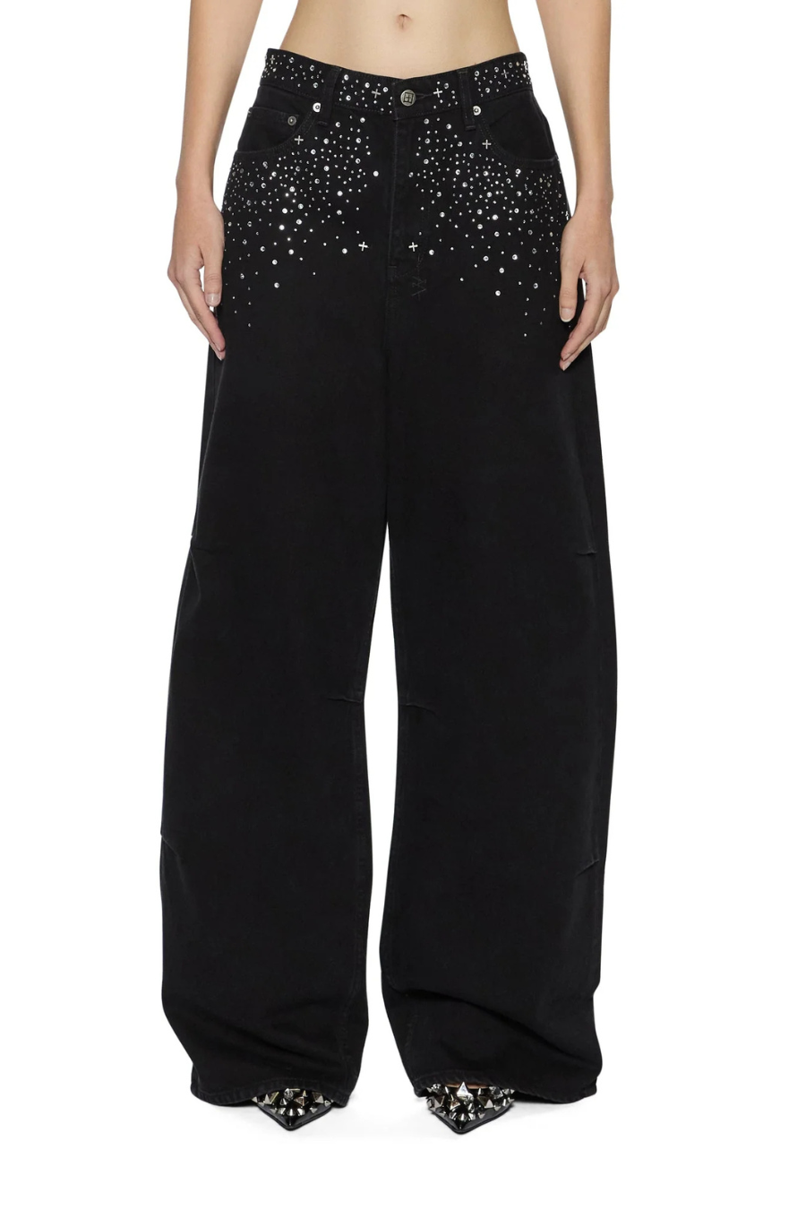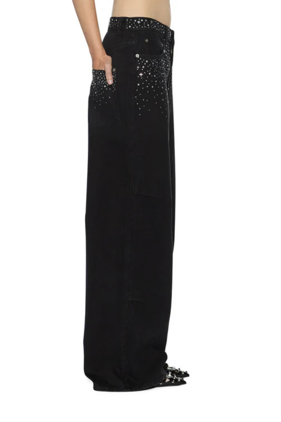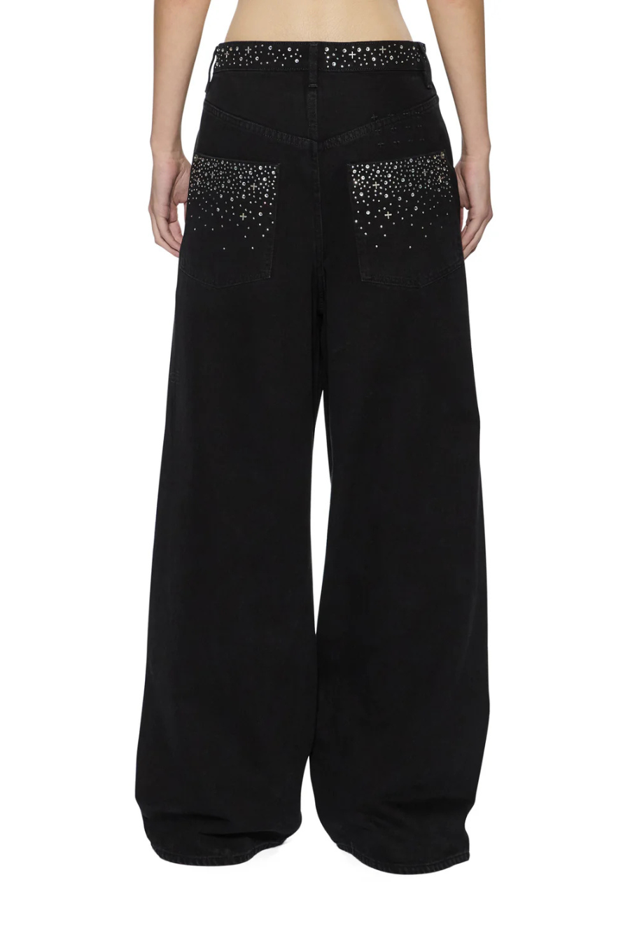 The Ksuper Renaissance Jet Black is our baggiest fit yet, featuring an exaggerated oversized silhouette with a super low rise and full length. Made from premium rigid Jet Black denim, it is detailed with densely scattered hotfix diamantes, studs, and signature Ksubi crosses on the waistband, front pocket openings, and back pockets, making this jean a bold statement piece. Finished with classic five-pocket styling, Ksubi branded anti-silver hardware, T-box and 3x4 embroidery, and a removable pocket tag attached to the wearer's right back pocket.
