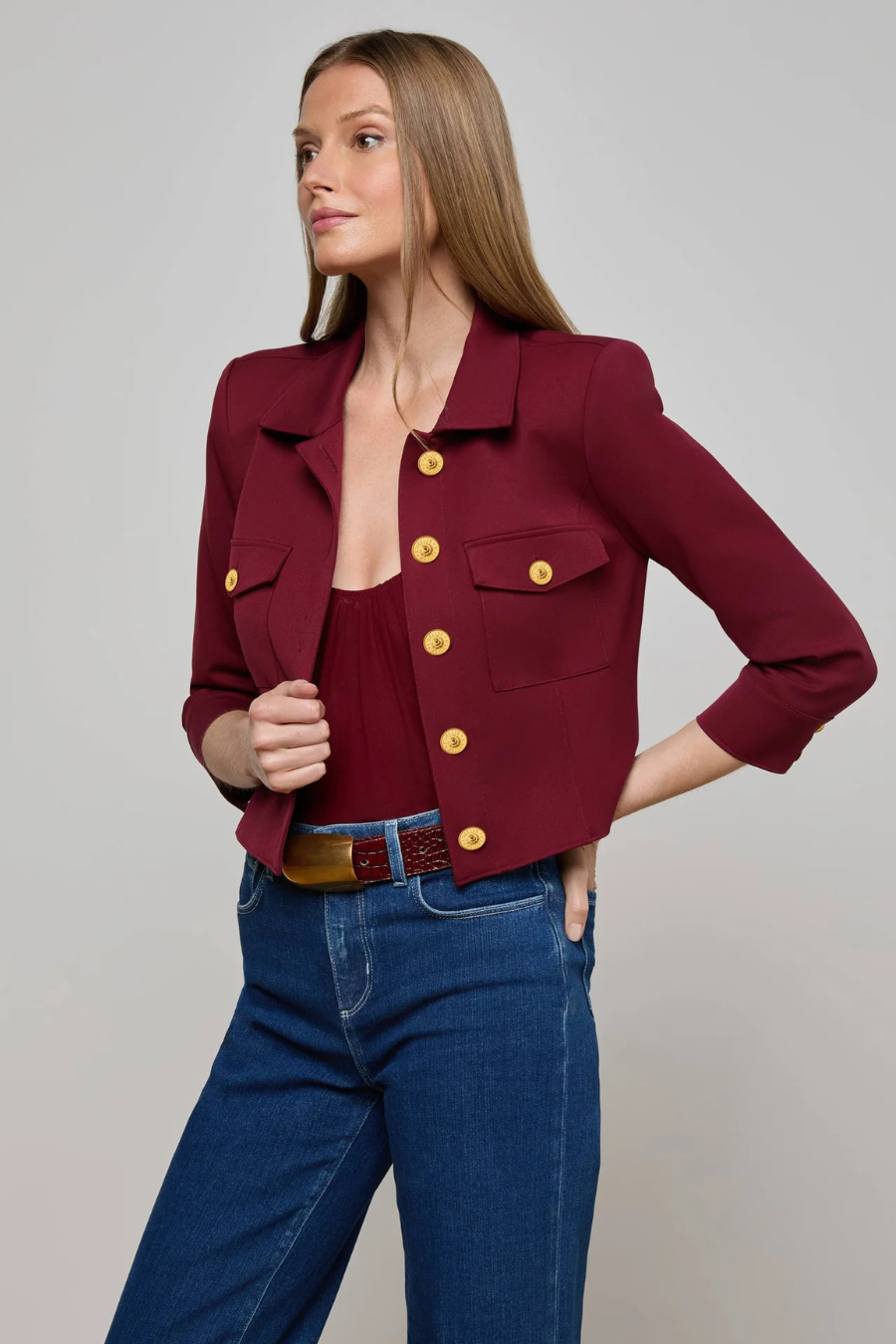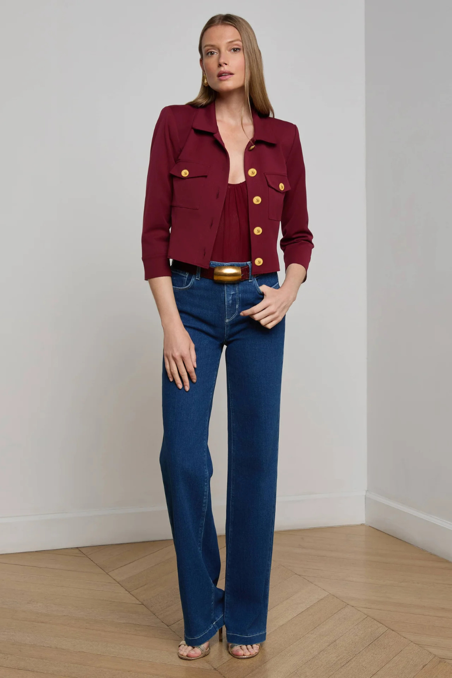 The Kumi is a modern update to the classic three-quarter sleeve jacket. A strong shoulder and tapered silhouette create flattering definition. This versatile black style is crafted from a supple stretch-suiting fabrication and finished with flap pockets and our signature gold embossed dome buttons. Pair with high-waisted denim for a perfectly proportioned look.