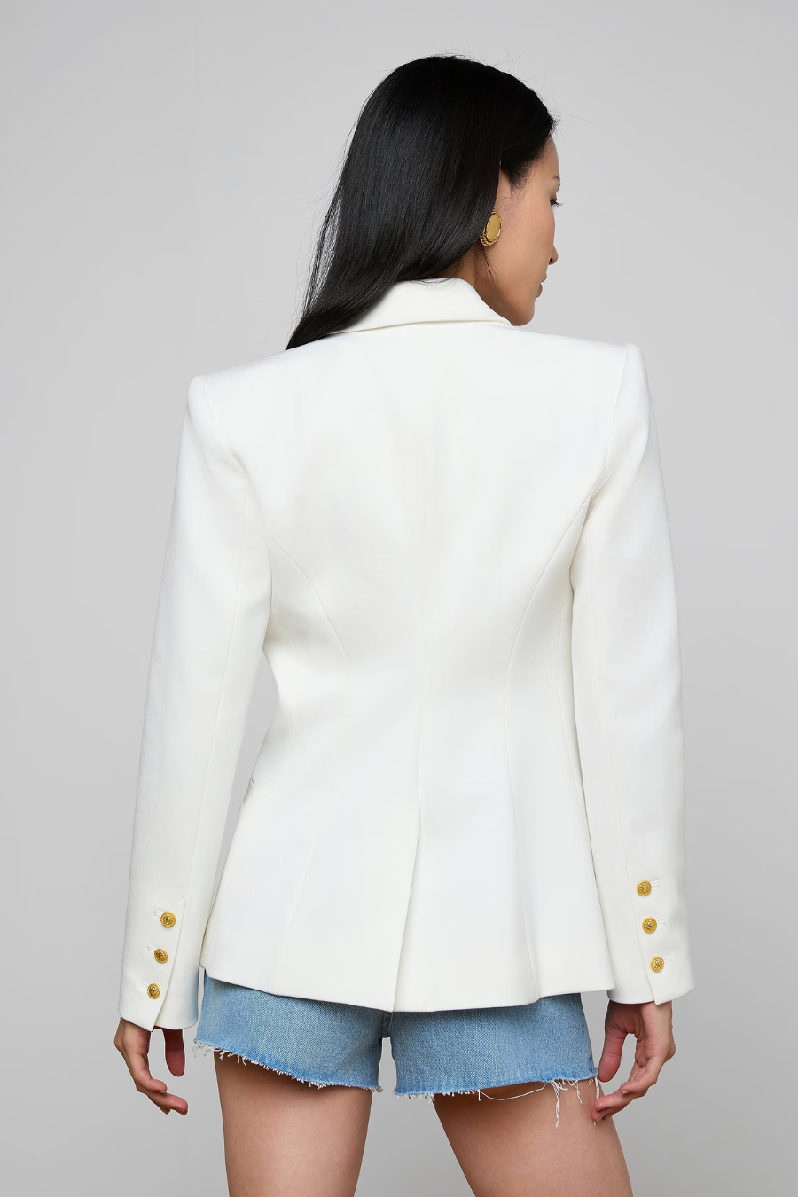 A timeless essential, the Kyomi is our signature double-breasted blazer offered in a longer line. Featuring a tailored, nipped-in waist that defines the figure, it's the kind of piece you'll reach for again and again, whether paired with skirts, trousers, or distressed denim.