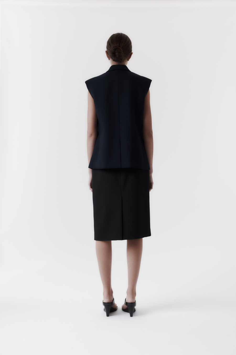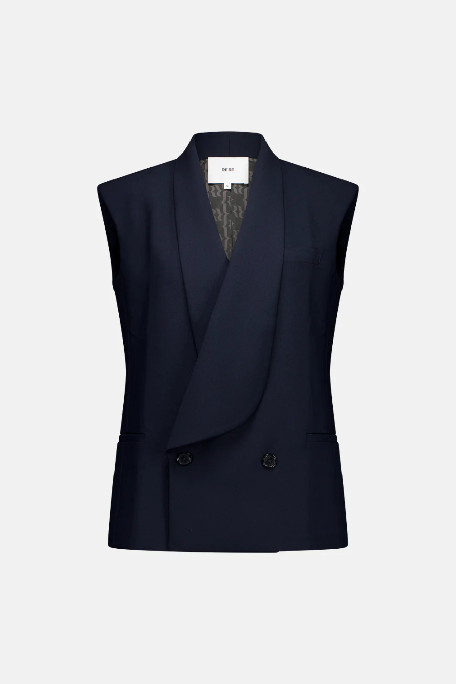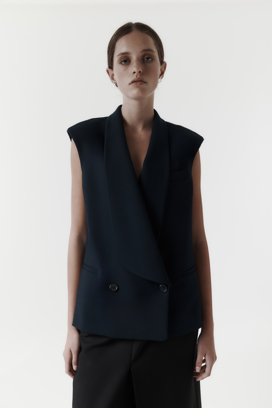 The Long Lapel Vest is crafted in our signature stretch suiting, featuring an elongated silhouette with statement lapels and a double-breasted front. Slightly tapered at the waist and balanced with internal shoulder padding, it offers a structured yet modern silhouette.