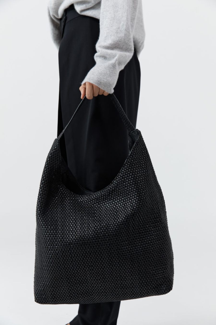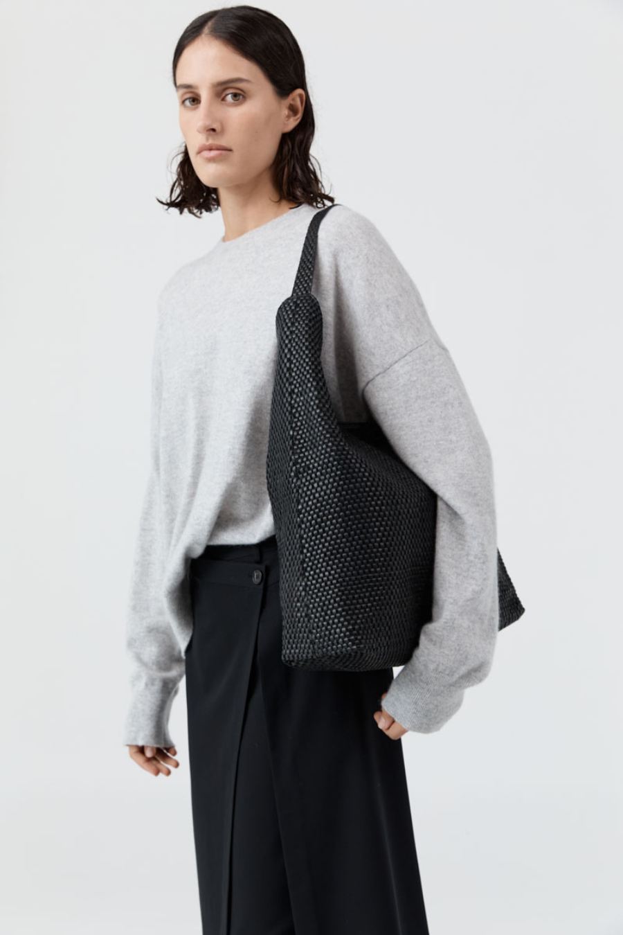The Lattice Weave Large Tote plays on exaggerated shapes and organic forms, offering a relaxed structure and oversized silhouette. An internal zip pocket provides secure storage, while the spacious design ensures high-rotation wear. Pair with minimalist wardrobe heroes for a refined interplay between the exaggerated and the understated.