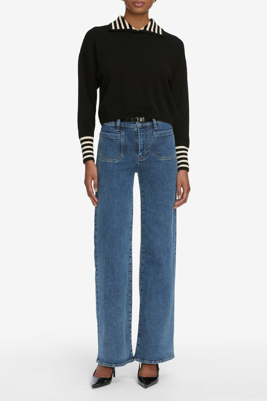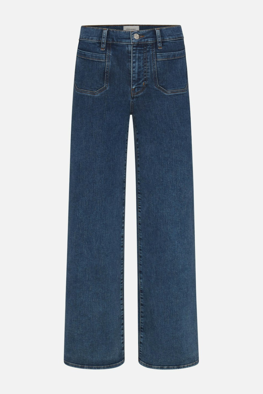 FRAME's best-selling Palazzo silhouette, now with chic front pocket details. This pair has a flattering high rise, fitted hip, and subtle wide-leg flare that hits at the floor. Crafted from a sustainable, ultra stretch cotton blend for soft and comfortable wear.