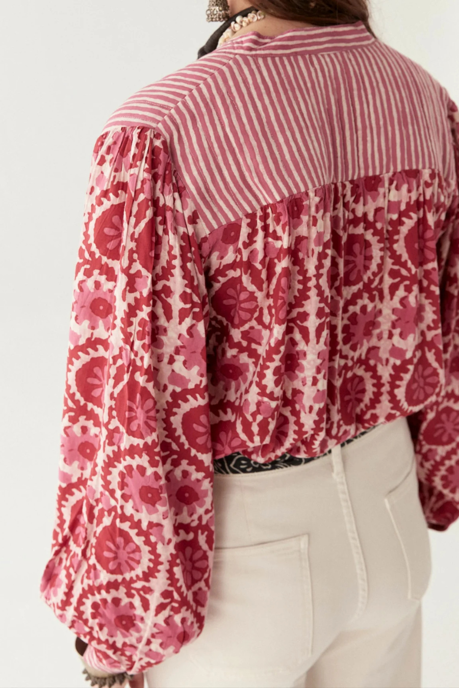 A chaotic symphony of florals collides with razor-sharp stripes—never blending, always clashing. Billowy balloon sleeves demand space, while the soft silhouette lets you move like you own the room. Dual energies, running parallel, forever aware, never merging.