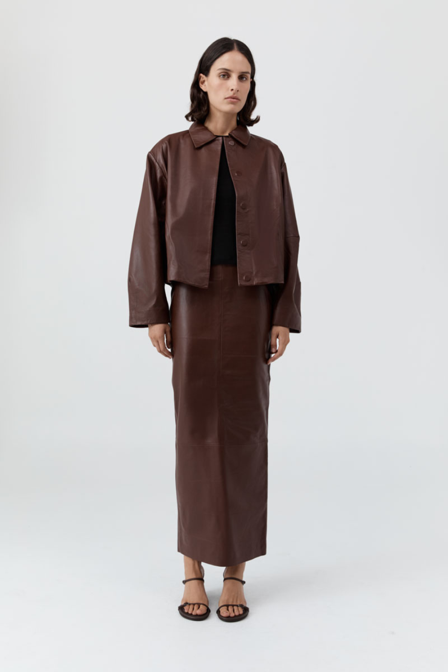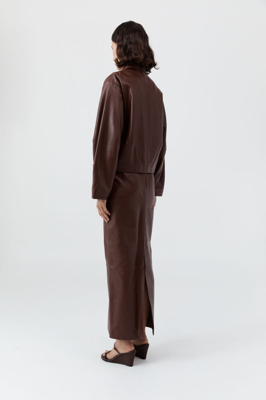 The Cocoon Leather Jacket features a relaxed fit with a collared neck and cocoon shaping. It includes front, back, and sleeve darts for a tailored look and is finished with concealed magnetic buttons for a sleek appearance. Crafted from 100% lambskin and lined with 100% TENCEL™ Lyocell.
