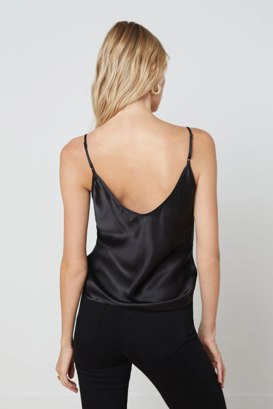A beautiful camisole in lustrous black silk charmeuse. Bias cut softly drapes and enhances the figure. Includes front-and-back V-necklines and adjustable spaghetti straps. Perfect on its own or as a base layering piece. 100% Silk.