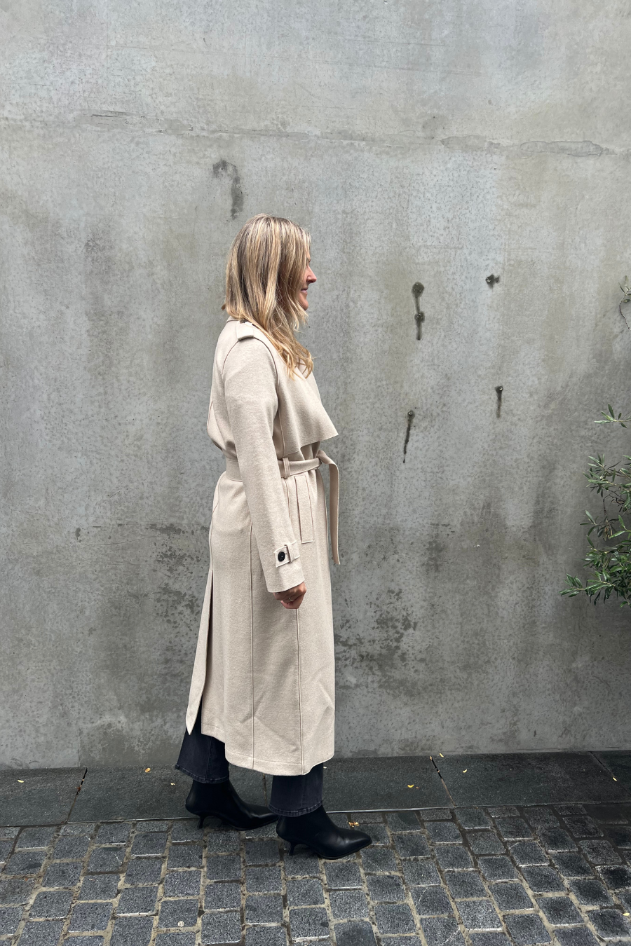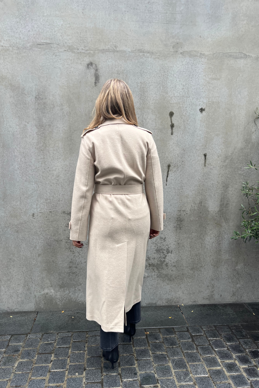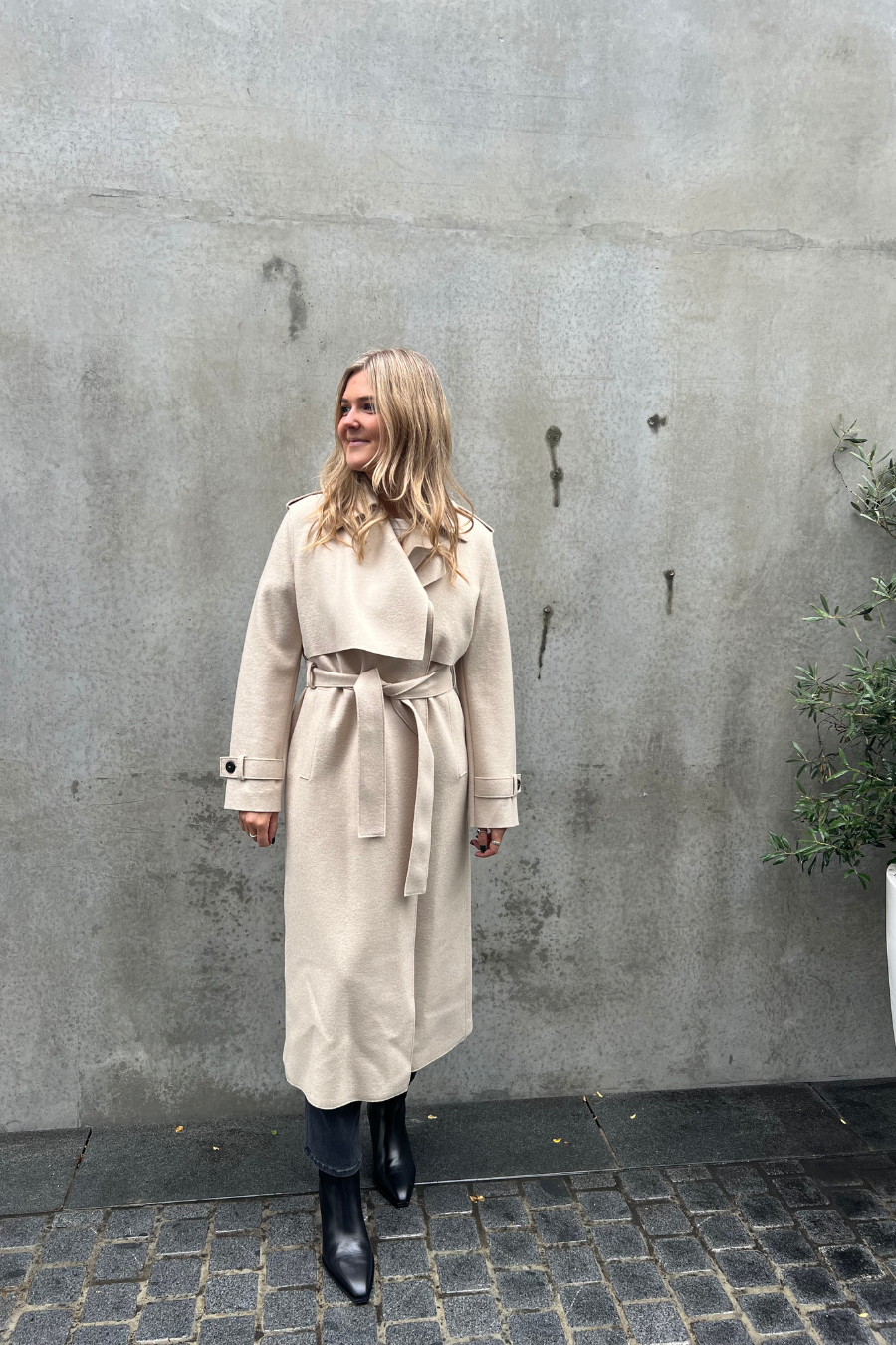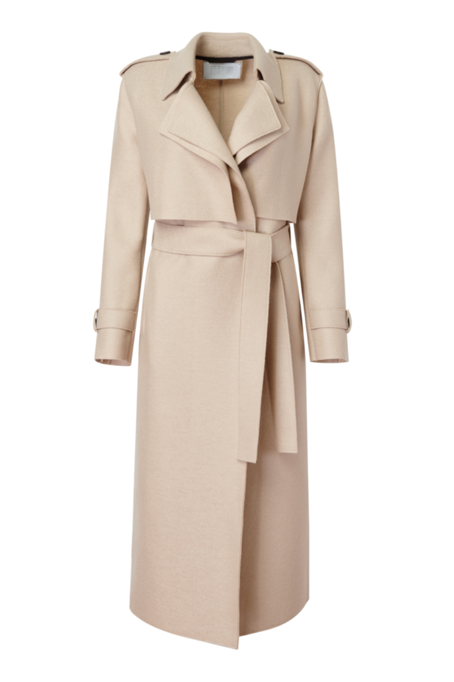 Double pressed wool trench style wrap long coat detailed with combined belt to tie at waist, notched lapels, belted snap cuffs, vertical pockets and rear vent.