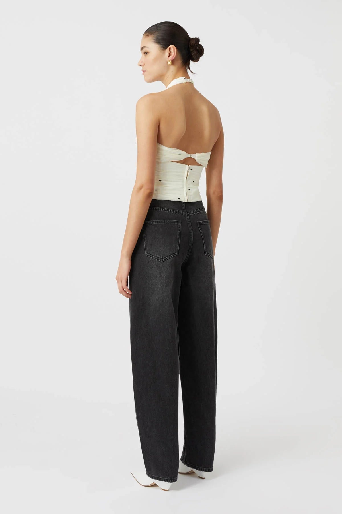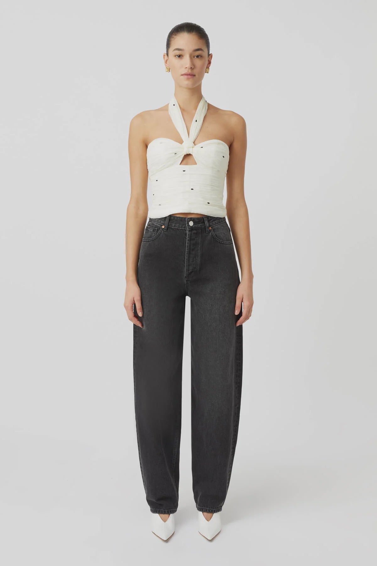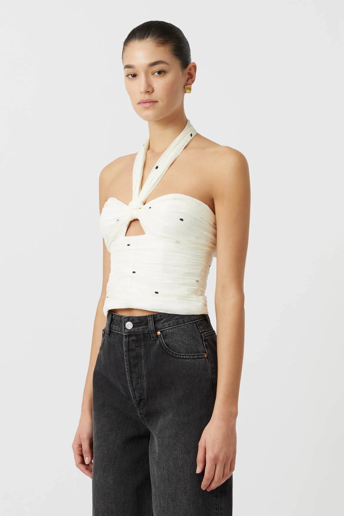 The Loren Top offers a captivating blend of playfulness and allure, featuring a close-fitting silhouette that accentuates the figure. Its knotted halter neck tie adds a touch of chic detail, complemented by a gathered bandeau top adorned with front and back cut-out details.
