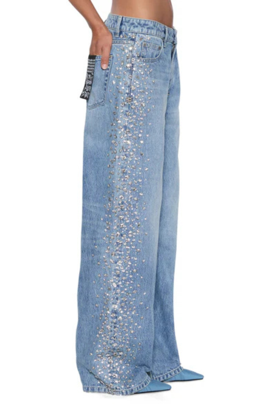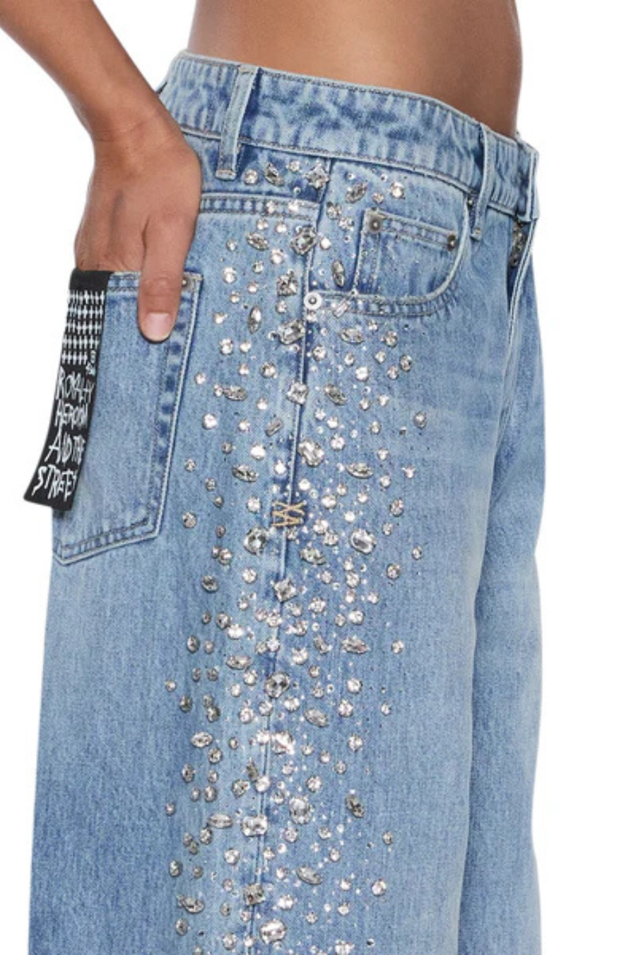 The Low Rider Kulture Krystal is a low-rise, relaxed straight-leg jean with classic five-pocket styling. Made from premium European rigid denim in a mid-blue wash with subtle wear and grinding at the waistband, pockets, and hem, it is hand-embellished with densely clustered diamante studs and rhinestones down the side seams, finished with Ksubi T-box and 3x4 branding, anti-brass hardware, and a removable pocket tag on the wearers right back pocket.