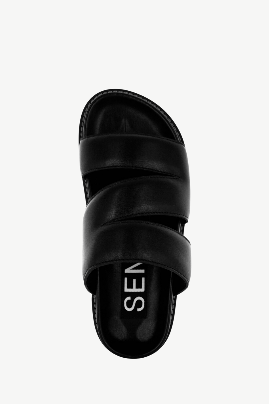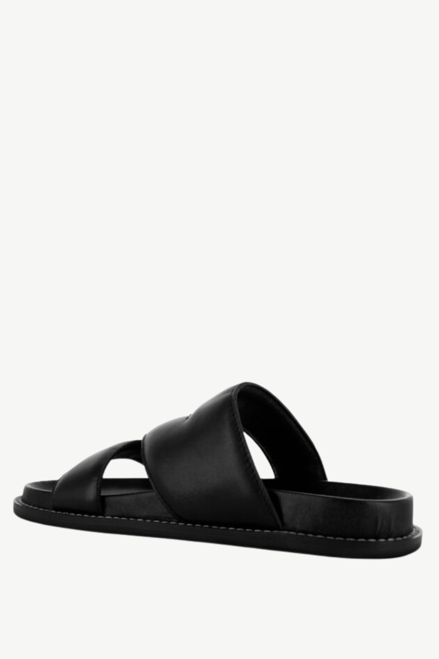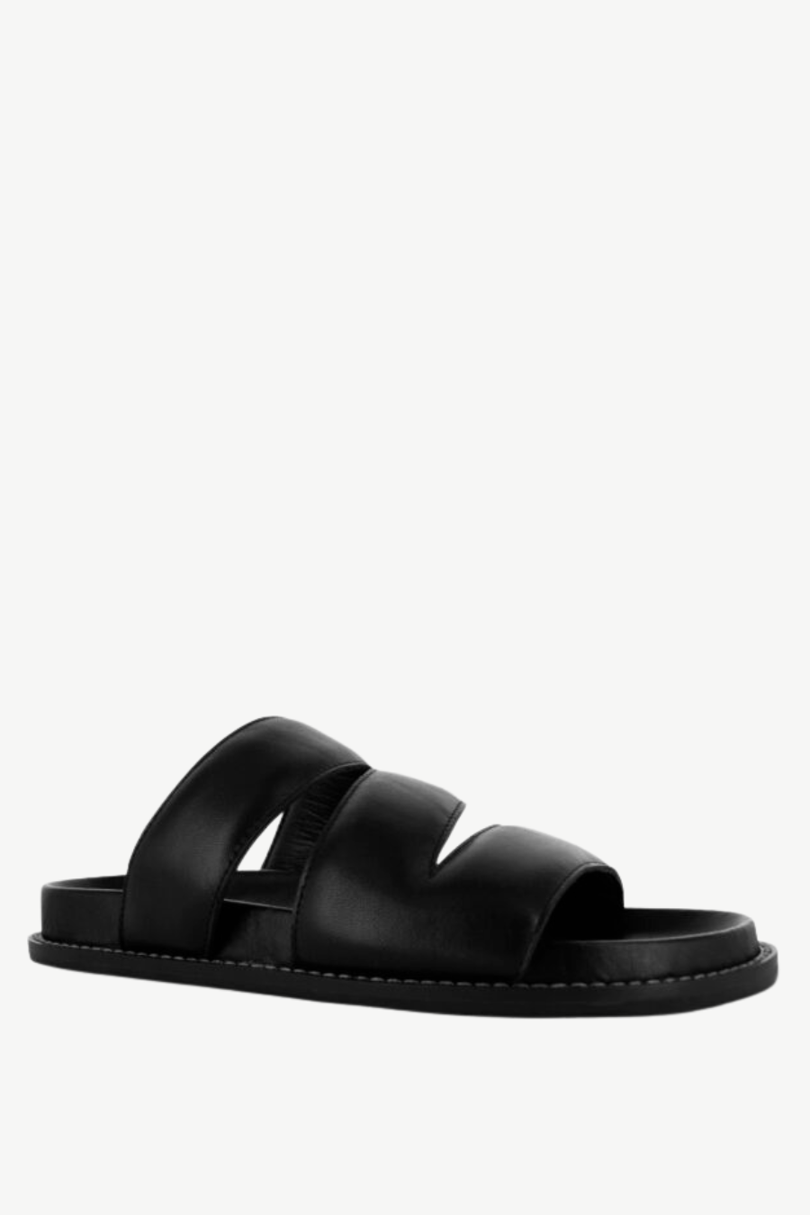 Ebony Kid Matte Leather, featuring a slip-on design, Zig-Zag strapping and a rounded toe.