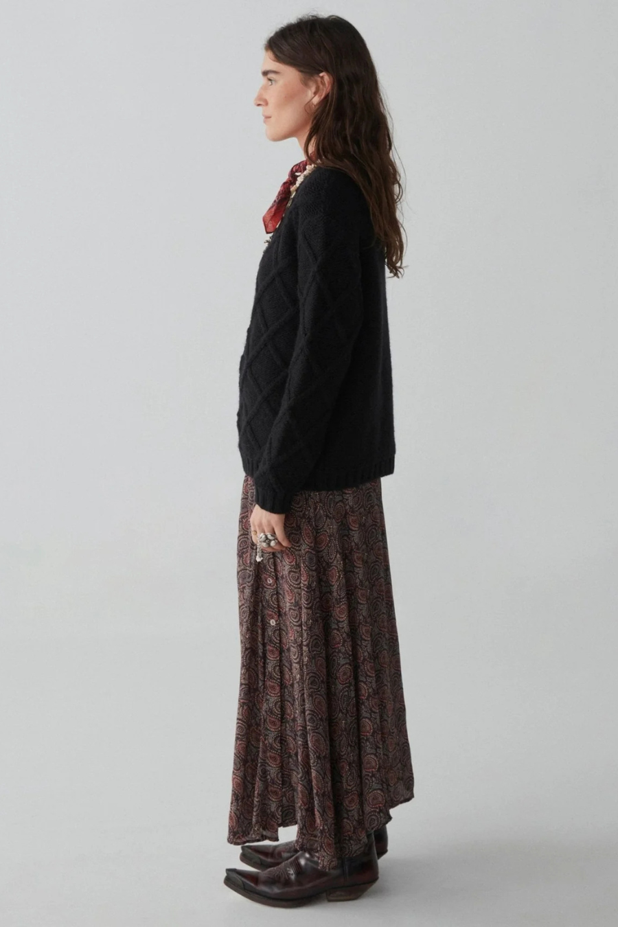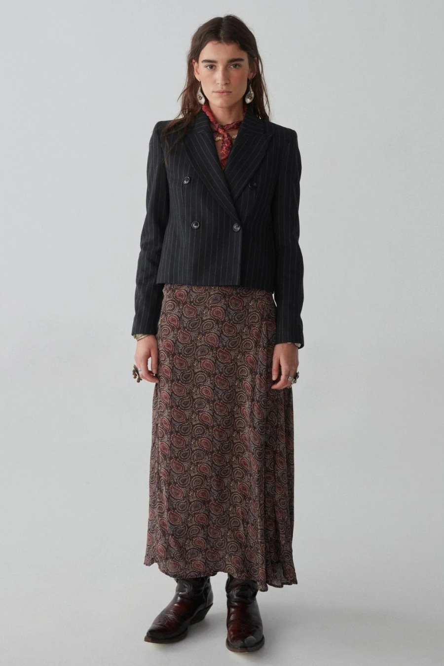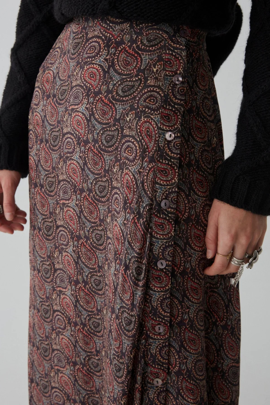 Our Lulu skirt is designed for those who appreciate the beauty of imperfection - its bohemian flair is underlined by a sophisticated cut, making it perfect for the free spirit who refuses to compromise on style. This maxi skirt is adorned with a swirling paisley pattern in earthy tones of deep red, brown, and gold.